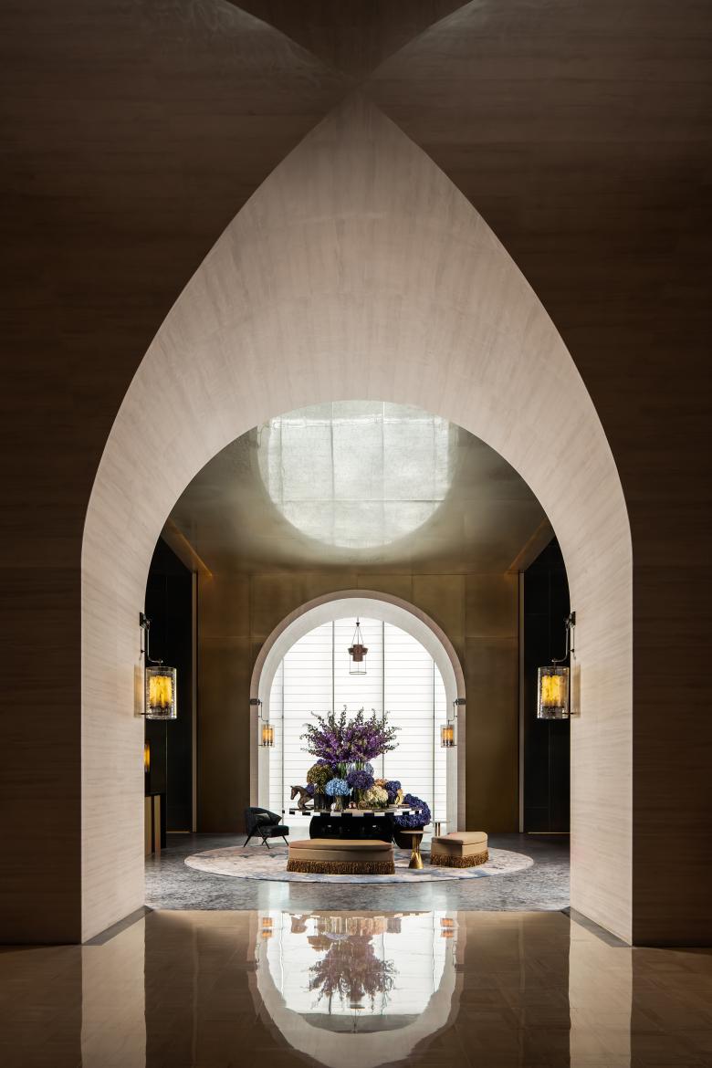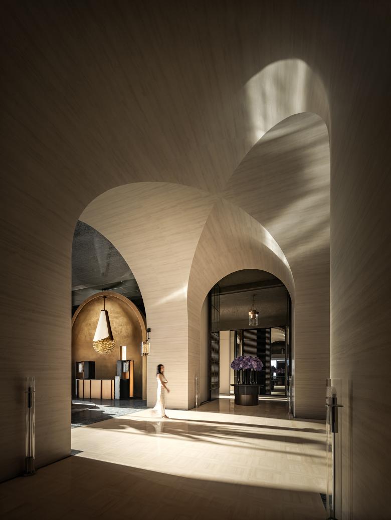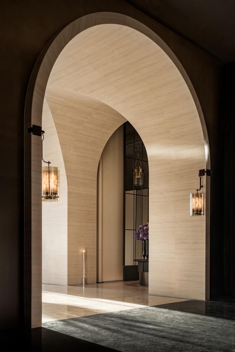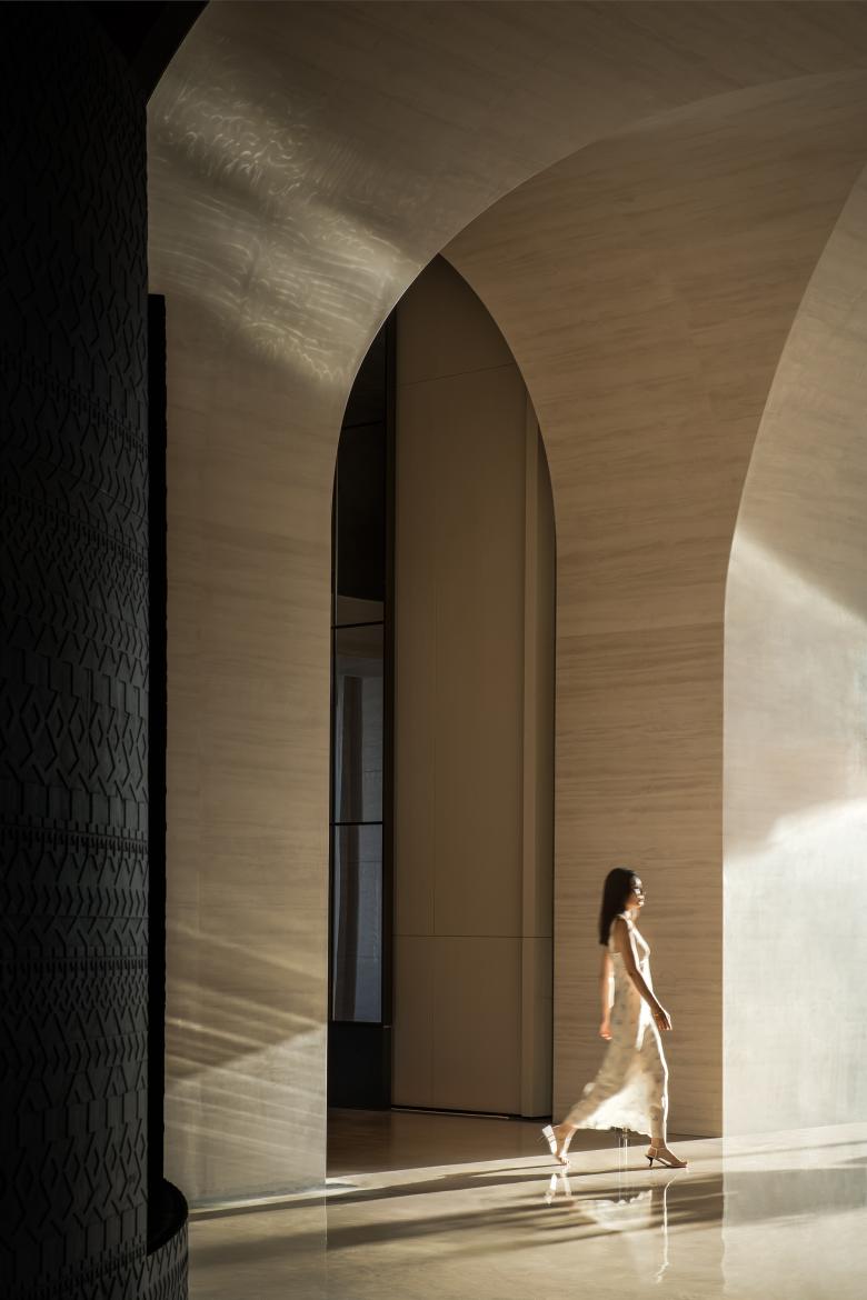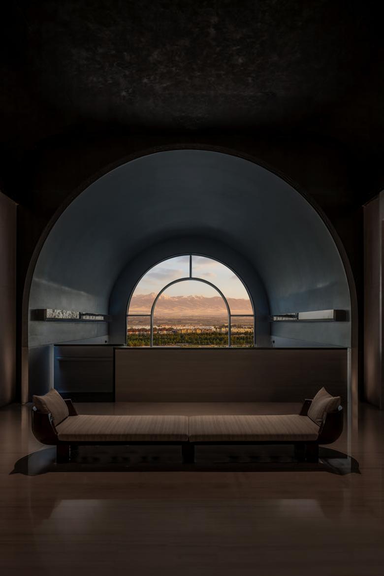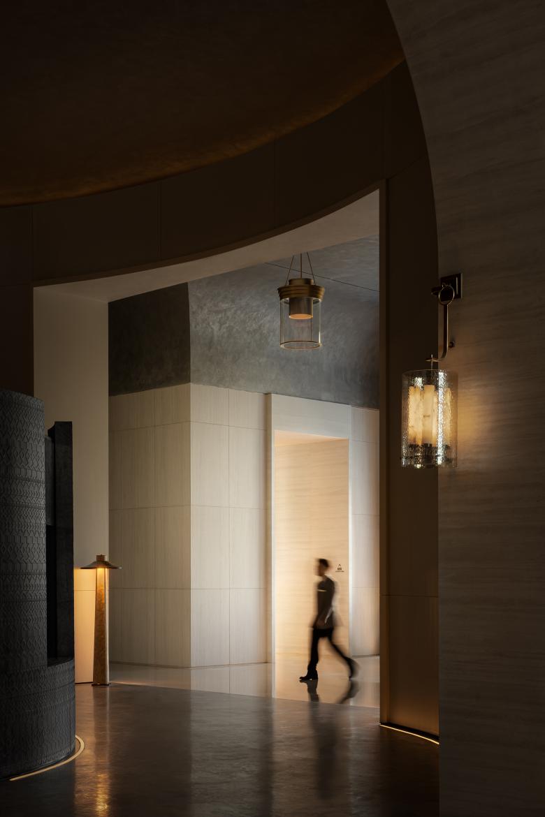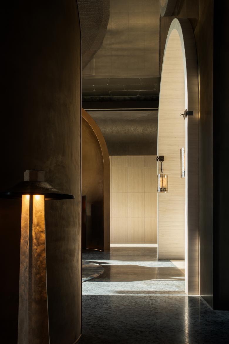 Stepping into the soaring 14-meter-high lobby feels like entering a contemporary museum of Silk Road civilization. Drawing inspiration from the ancient Wusun Trail, the sweeping curved ceiling reveals itself like a celestial expanse, conjuring the vast, starlit sky that once illuminated the Silk Road. The design distills the iconic arches of Yining’s vernacular houses into minimalist geometry, establishing a sense of solemnity and ritual. Handwoven wool tapestries trace the ancient Silk Road routes, and bronze lanterns recall the distant chimes of caravans from millennia past. Every detail is carefully crafted, quietly narrating the region’s unique cultural memory. Artisanal décor with regional flair enlivens the space, creating a leisurely ambiance reminiscent of Yining’s traditional courtyards. The corridor encapsulates the essence of Xinjiang’s living room culture, where the timeless legacy of the Silk Road engages in a silent, profound dialogue with contemporary art.