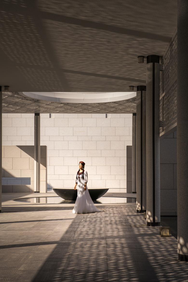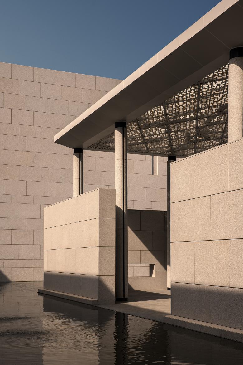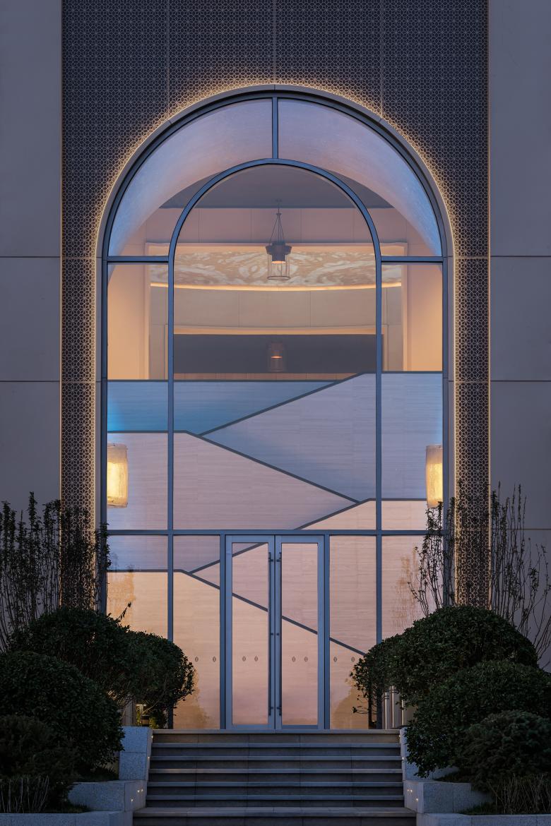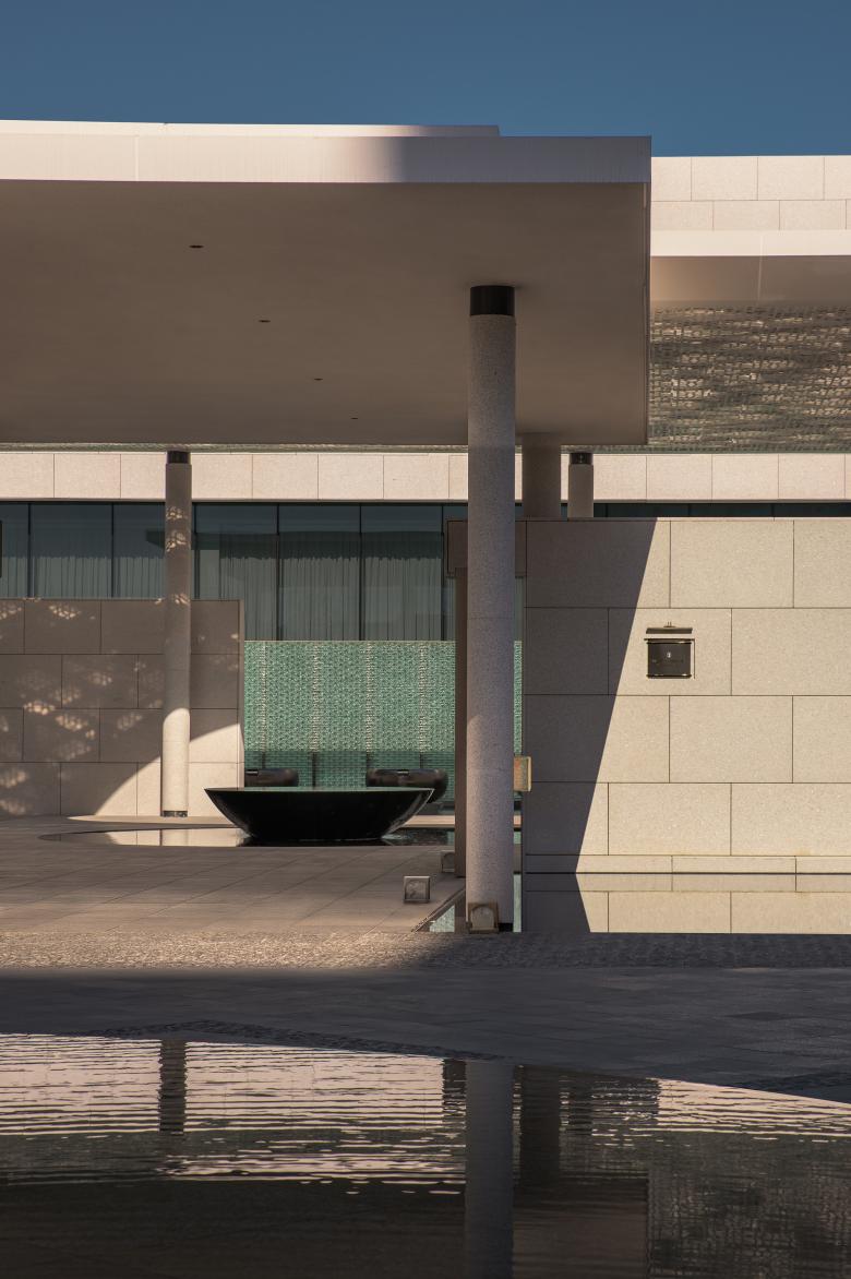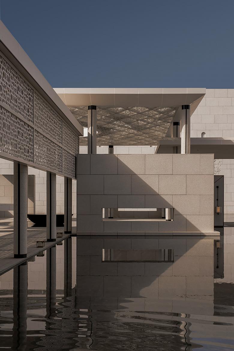 Beyond the city’s clamor, guests are welcomed into a tranquil retreat, where a manor-style garden sets the prelude to a ceremonial journey of discovery. Inspired by traditional courtyard dwellings in the Ili River Valley, the entrance unfolds as a tri-winged architectural cluster. Four distinct courtyards compose a rhythmic spatial sequence that flows from openness to intimacy, gently guiding guests through a subtle transition of mood. Local elements are reimagined through contemporary materials and craftsmanship—with the iconic blue palette of Yining houses and the intricate Kazakh wood carvings translated into refined architectural touches, most notably in the porch details. Shimmering water animates the buildings, leading travelers into a sanctuary of serene elegance.
