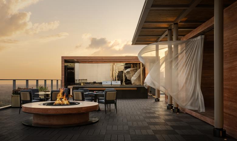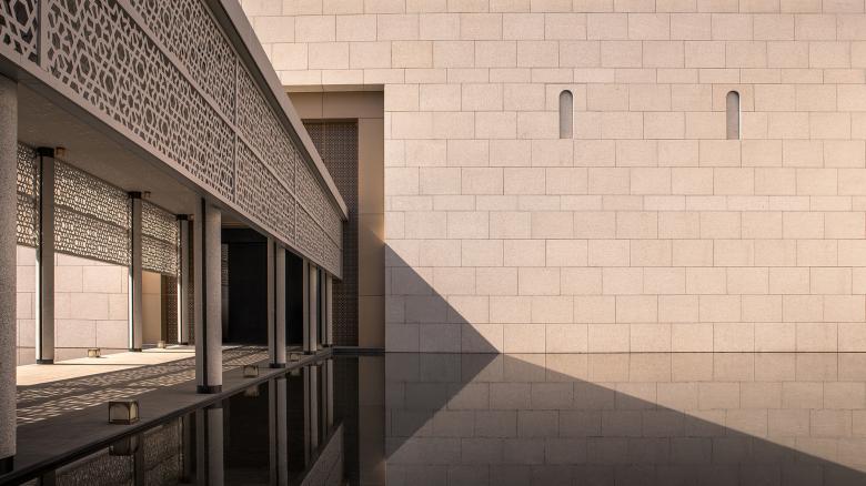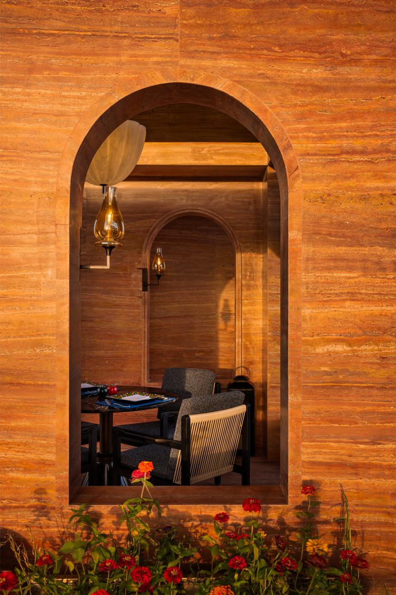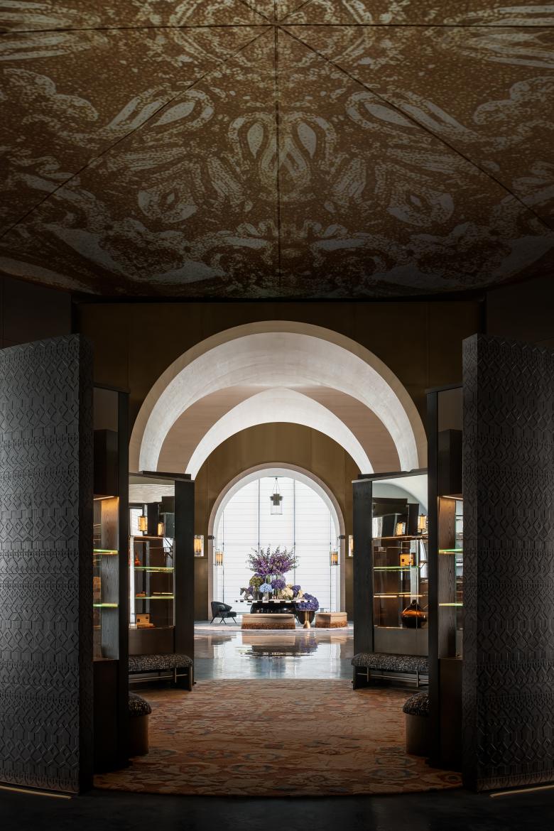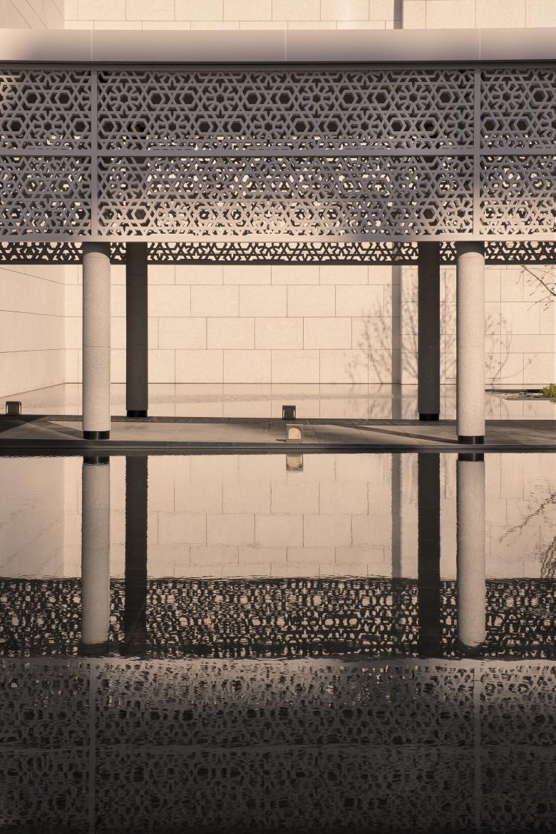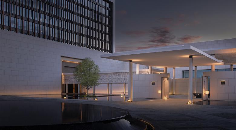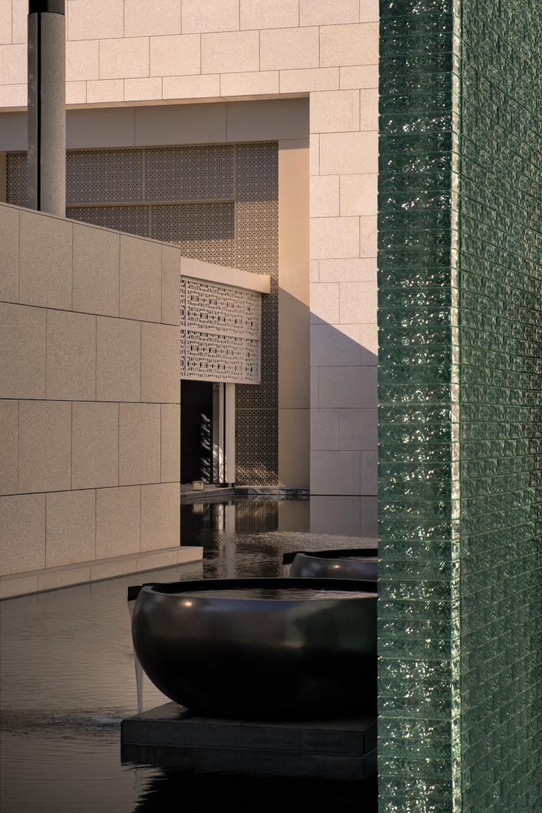 Beyond the city’s clamor, guests are welcomed into a tranquil retreat, where a manor-style garden sets the prelude to a ceremonial journey of discovery. Inspired by traditional courtyard dwellings in the Ili River Valley, the entrance unfolds as a tri-winged architectural cluster. Four distinct courtyards compose a rhythmic spatial sequence that flows from openness to intimacy, gently guiding guests through a subtle transition of mood. Local elements are reimagined through contemporary materials and craftsmanship—with the iconic blue palette of Yining houses and the intricate Kazakh wood carvings translated into refined architectural touches, most notably in the porch details. Shimmering water animates the buildings, leading travelers into a sanctuary of serene elegance.