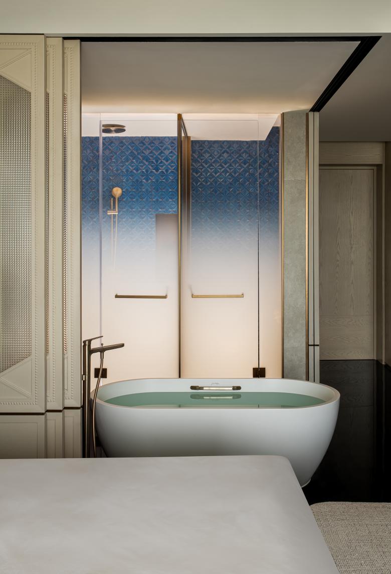 Bathed in the hues of “Yining Blue,” the guestrooms and suites evoke a tranquil dreamscape of sky and sea. The palette of soft grey and blue meets warm oak finishes, echoing the calm of the Ili River. Floor-to-ceiling windows open to sweeping views of the river valley, capturing the ever-changing sunlight and landscape. The walls carry Yining’s cultural imprint—abstract pomegranate floral patterns, distinctive window forms, and color accents derived from lavender fields, apricot blossoms, and autumn wetland reeds—each element quietly narrating the story of the land. Textured wall surfaces recall the rustic charm of traditional rammed earth, rendered in matte metal panels. Vine motifs from local wood carvings are abstracted into screen patterns, casting a poetic, ever-shifting interplay of light and shadow. Custom furnishings, artisanal woodwork, and intelligent systems weave a modern retreat of understated luxury. In every detail, the echoes of history linger, and the space becomes a quiet, contemplative storyteller.
