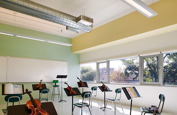Jettisoning the conventions of New York City school construction, we used precast concrete plank and steel for the structural system because it was less expensive, faster to build, and, in conjunction with exposed mechanical systems, allowed for higher ceilings and more spacious classrooms. Instead of the usual costly masonry exterior, we chose light-weight industrial colored metal claddings to mark the different academies. A small expanse of blue polished tile and glass highlights the special shared rooms for music and science, appearing like a beacon for the ambitions of the school.