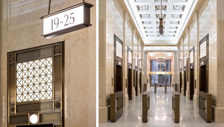 At the building’s historic entries, BBB replaced the non-original dark Indian Green marble that had infilled the 34-foot archways with a glass and ornamental bronze grill transom, adapted from the building’s original drawings, allowing natural light into the lobby. Additional upgrades include a new lighting system with hanging bronze chandelier fixtures, granite accent wall, reception desk, elevators, and signage.