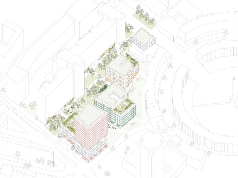 Gemeinsam bilden diese vielschichtigen Nutzungen einen robusten und urbanen Stadtbaustein der sich räumlich mit seinem Kontext vernetzt und verbindet. Die Höhenentwicklung des neuen Stadtbausteine greift die heterogenen Höhen des Bestandes an verschiedenen Punkten auf und fügt sich in diese ein ohne zu dominant zu sein. Der Bezug zur denkmalgeschützten Ringbebauung wird mit Sorgfalt behandelt um diese nicht zu überformen. Durch die präzise Setzung der neuen Hochpunkte wird der gesamte Block zwischen Friedrichstraße, Wilhelmstraße und Mehringplatz als Ensemble gestärkt.