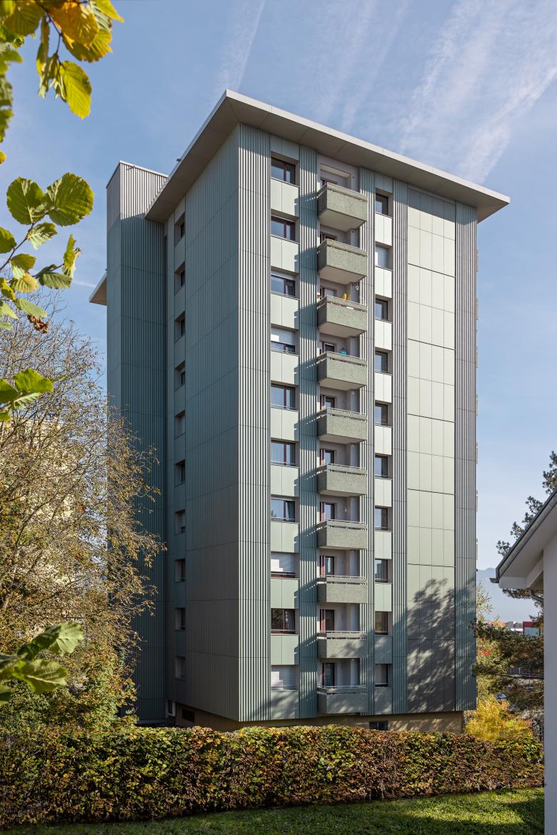 Ein zehngeschossiges Haus in Rapperswil-Jona am Zürichsee wurde vor kurzem energetisch saniert. In die neue Fassade aus Faserzement wurde eine farbige und hocheffiziente Photovoltaikanlage integriert. Wie Ziernähte schmückt diese nun zwei Seiten des Hauses.