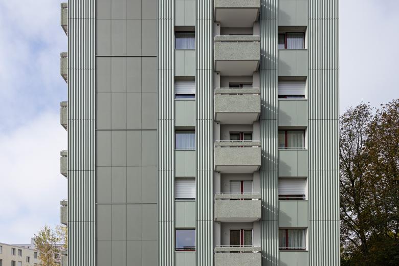 Charakteristisch für das Haus sind die vertikal übereinander liegenden Balkone aus Waschbeton. Diese wollten die Architekten unbedingt erhalten, weil sie prägend für die Fassadenstruktur sind. Um die Vertikalität zu betonen, wurden die Bereiche über und unter den Balkonen sowie der Fensterbereich mit flachen Faserzementplatten bekleidet, links und rechts von den Balkonen hingegen mit Wellplatten aus Faserzement in der gleichen Farbe. Die Ost- und Westseite des Hauses ziert zusätzlich noch ein vertikaler Streifen aus Photovoltaik-Modulen in grünlich-grauem Farbton.