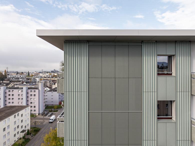 Die Architekten wählten eine Fassadenbekleidung aus Faserzementplatten in einem grünlichen Ton der Firma Swisspearl. Architekt Alex Dietl erinnert sich gerne an die Bemusterung: «Bei der Bemusterung haben wir die grüne Faserzementplatte direkt an die Balkone gehalten und gesehen, wie schön sich die Farbe der Platte an, die des Waschbetons anpasst. Im Sonnenlicht haben Waschbeton und Faserzement einen grünlichen Ton, im Schatten haben beide einen gräulichen Ton.»