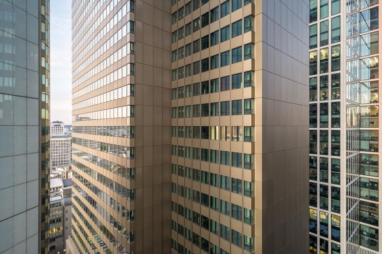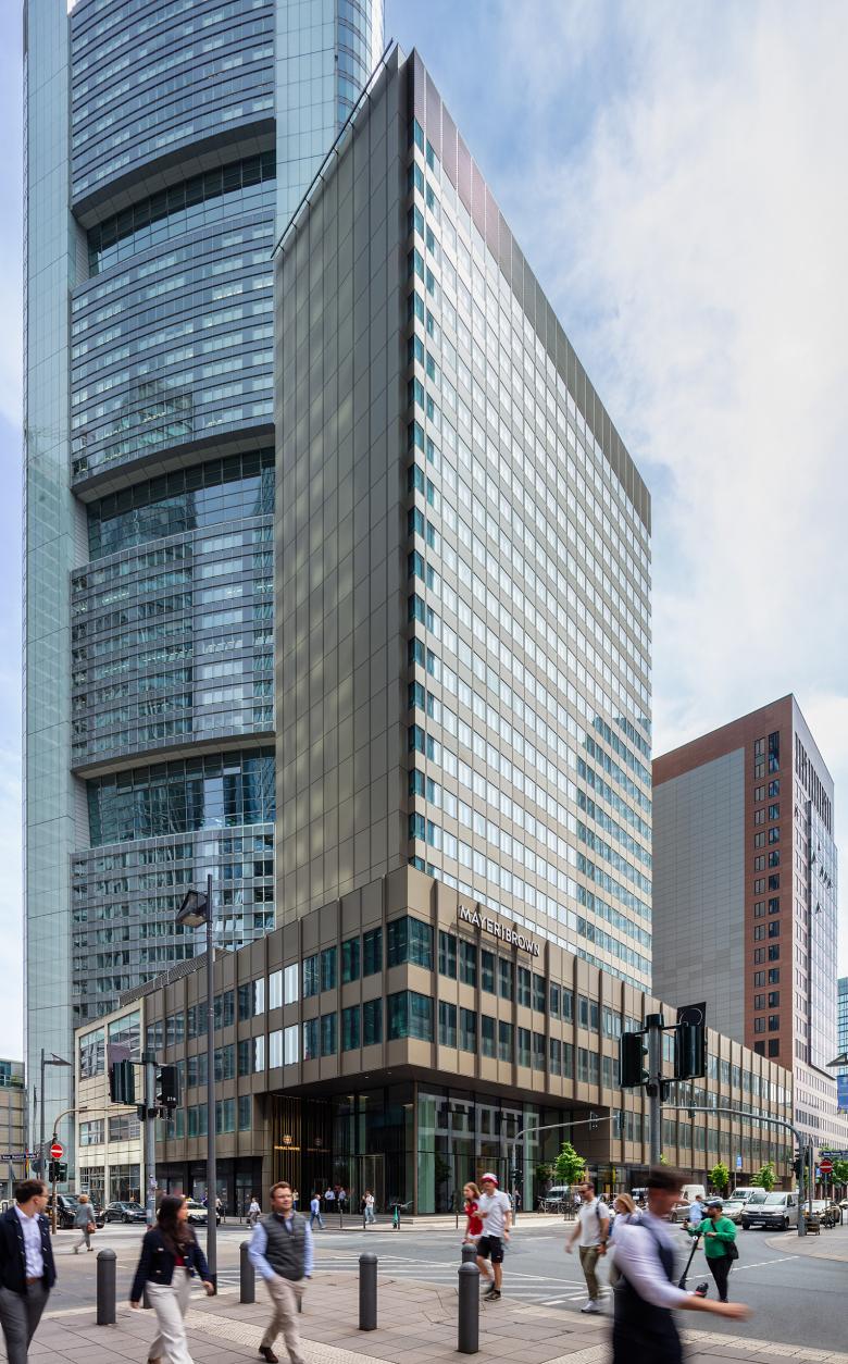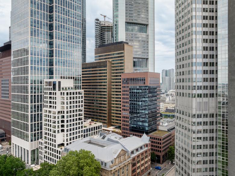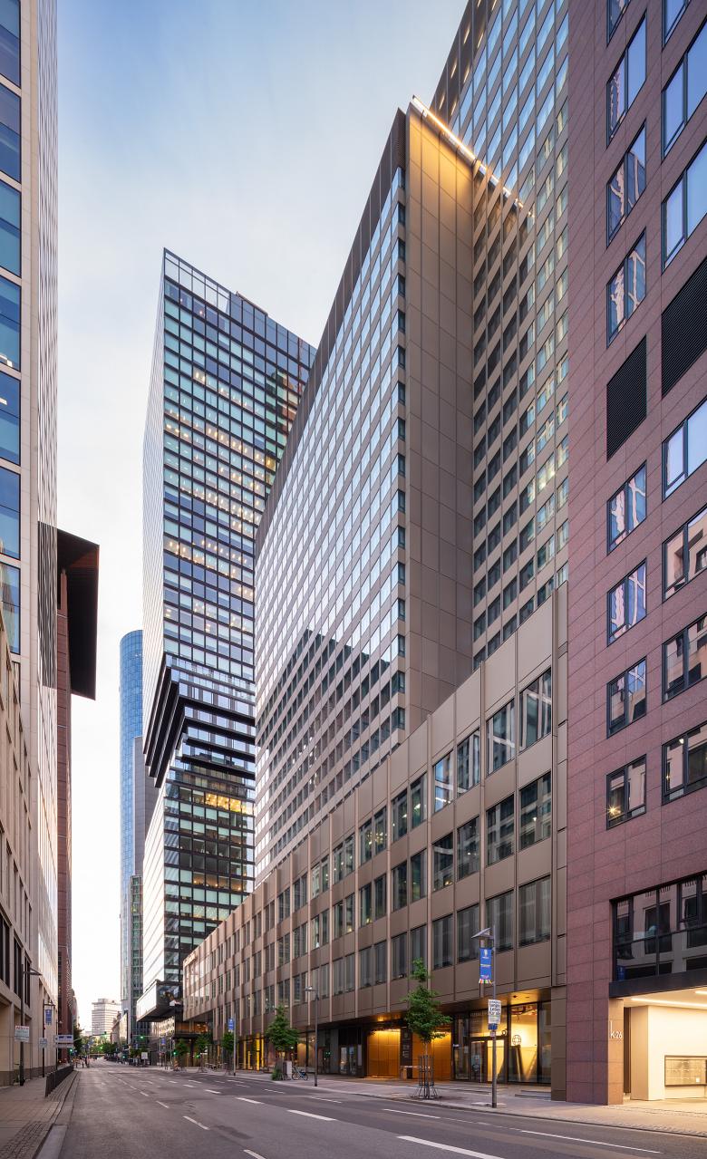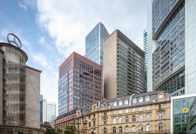 Mitten im Frankfurter Central Business District steht das 1974 erbaute, frühere Commerzbank-Hochhaus. 1968 ging der Frankfurter Architekt Richard Heil als Sieger aus einem Wettbewerb unter sieben Büros hervor, an dem untere anderem auch Ludwig Mies van der Rohe teilnahm. Mit 110 Metern Höhe war das Bürohaus, das sich mit zwei schlanken Scheiben aus einem viergeschossigen Sockelbau erhebt, ein Pionier der Frankfurter Skyline. Inzwischen sind auch die drei weiteren Ecken der Straßenkreuzung mit einem Hochhaus besetzt; Taunusturm, Japancenter und Omniturm bilden eine im Stadtbild sehr präsente Formation aus. Im Rahmen einer umfangreichen Revitalisierung haben wir das zuletzt eher unauffällige und in die Jahre gekommene denkmalgeschützte Bürohochhaus vom dritten Untergeschoss bis in die 30. Etage bis 2022 kernsaniert und zum Global Tower transformiert. Seiner Zeit einen Schritt voraus bietet der markante Turm auf 48.500 Quadratmetern BGF nun ideale Bedingungen für Arbeit und Aufenthalt, lokal und digital.