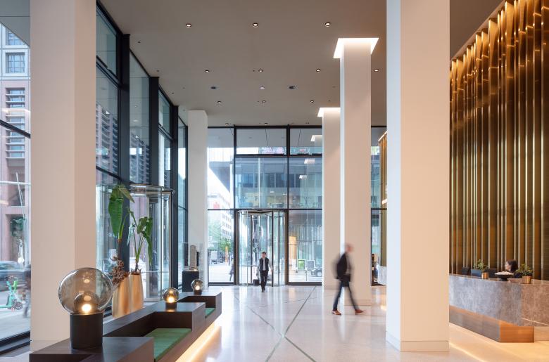 Um den Global Tower mit einer deutlicheren Geste in den Stadtraum zu öffnen, verlegen wir den Eingang an die Gebäudeecke, ergänzen eine öffentliche Nutzung und gestalten das Foyer zweigeschossig. Das Auditorium des prominenten Nachbargebäudes von Norman Foster wird mitgenutzt – der Global Tower sucht den Dialog mit der Umgebung. An der langen Flanke bleibt ausreichend Platz für Ein- und Ausfahrt der in den Bestand eingefügten Tiefgarage. Die Bürogeschosse der Etagen 5 bis 14 lassen sich entsprechend der Nutzerwüsche um den zentralen Kern an der Schnittstelle der beiden Hochhausscheiben organisieren. Vom Einzelbüro bis Großraum und Open Plan sind alle Spielarten des New Work bereits mitgedacht. Eine Herausforderung stellt die Sanierung der denkmalgeschützten Fassade dar, die wir in Zusammenarbeit mit Werner Sobek technisch überarbeitet und zukunftsfit gemacht haben, ohne dabei die charakteristische Ansicht im schlicht-eleganten Duktus der 1970er Jahre zu überschreiben.