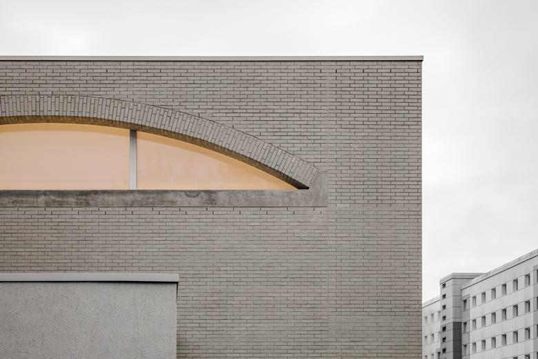 Coppi-Gymnasiums und schafft durch die eigenständige Architektur neue Qualitäten. Das maßgebliche Gestaltungselement wird durch ein dreiteiliges sichtbares tonnenförmiges Dachtragwerk definiert, das die typologische Sonderform in Innenund