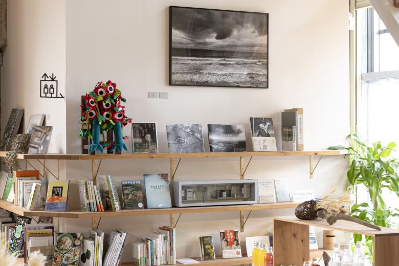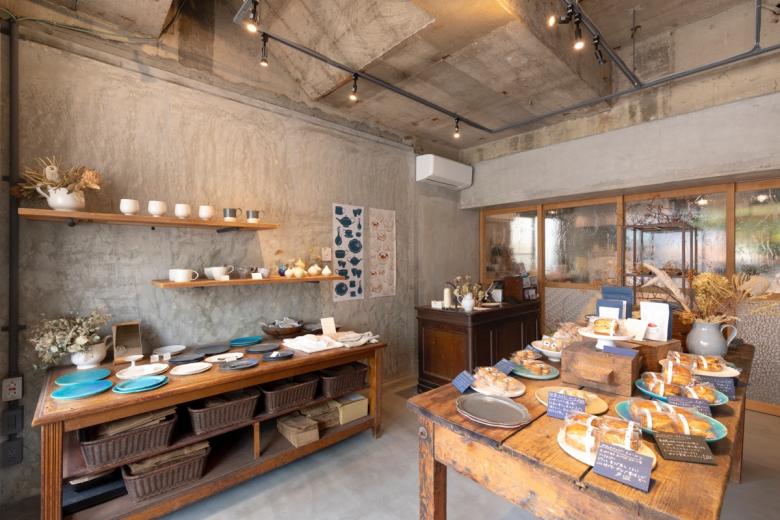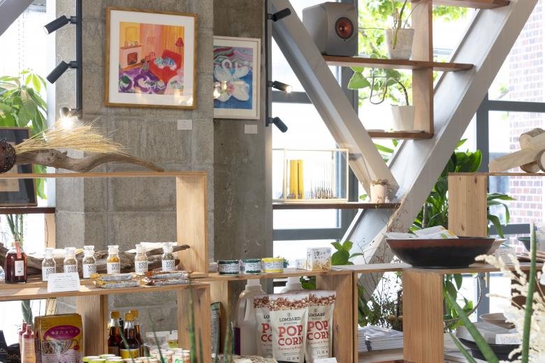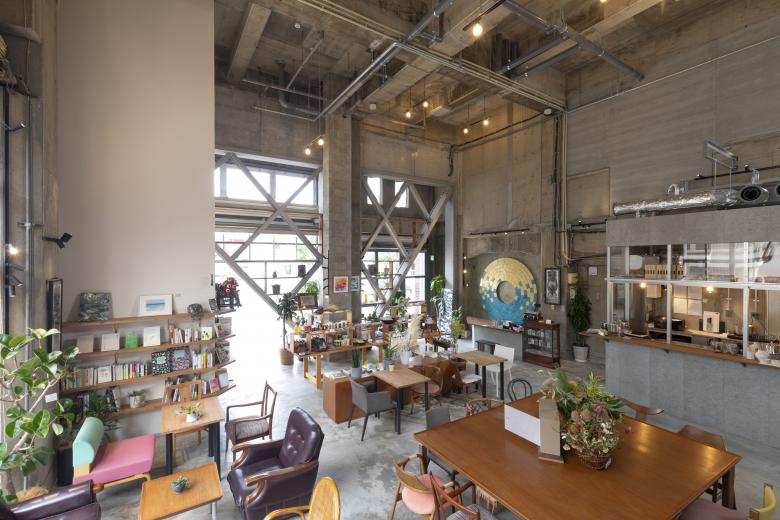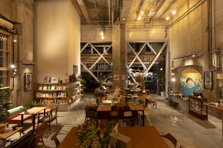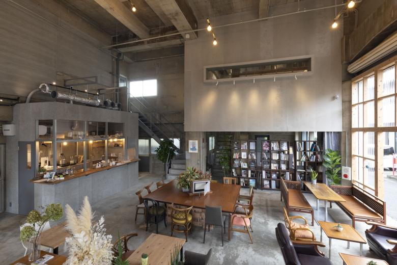 1階には、二層吹き抜けの「HAJIMARI LOUNGE」と「喫茶ゆあみ」、そしてガラス越しにまちとつながる陶芸工房+ショップ「うみとじかん」、さらにDABURA.mのオフィスを配置。まちの人々から譲り受けた思い出の椅子や、器、本、そしてアートが混ざり合い、自然と人が集まる広場のような雰囲気を生み出しています。耐震補強のブレースは、あえて視線を妨げないメッシュ状の設計とし、アートや植栽の展示にも活用しています。