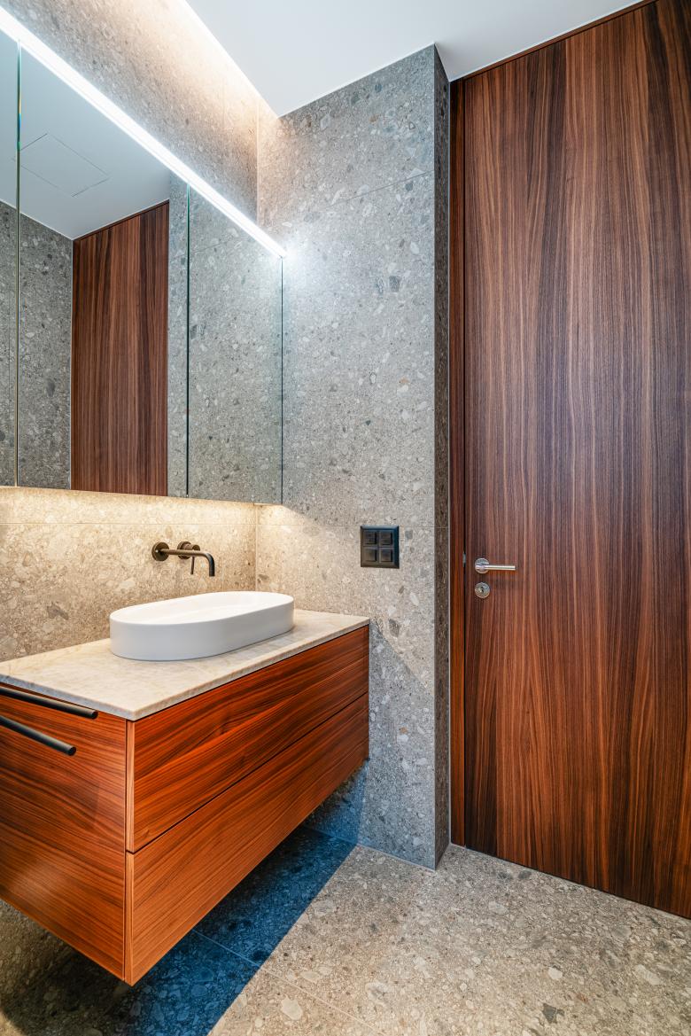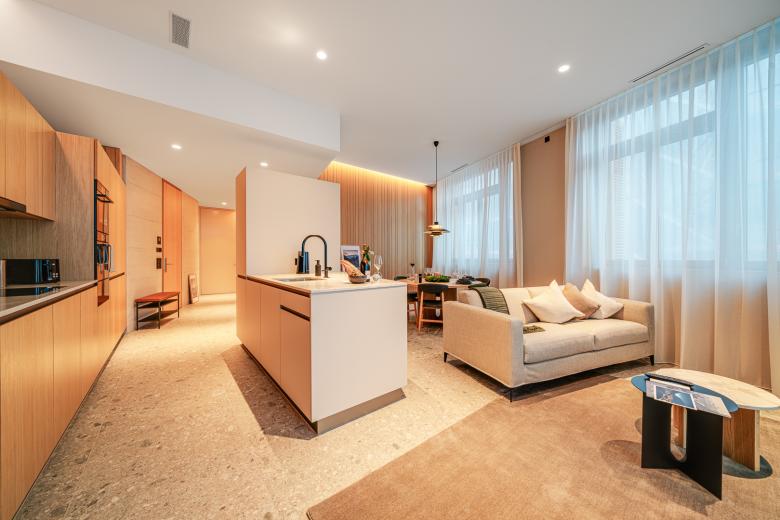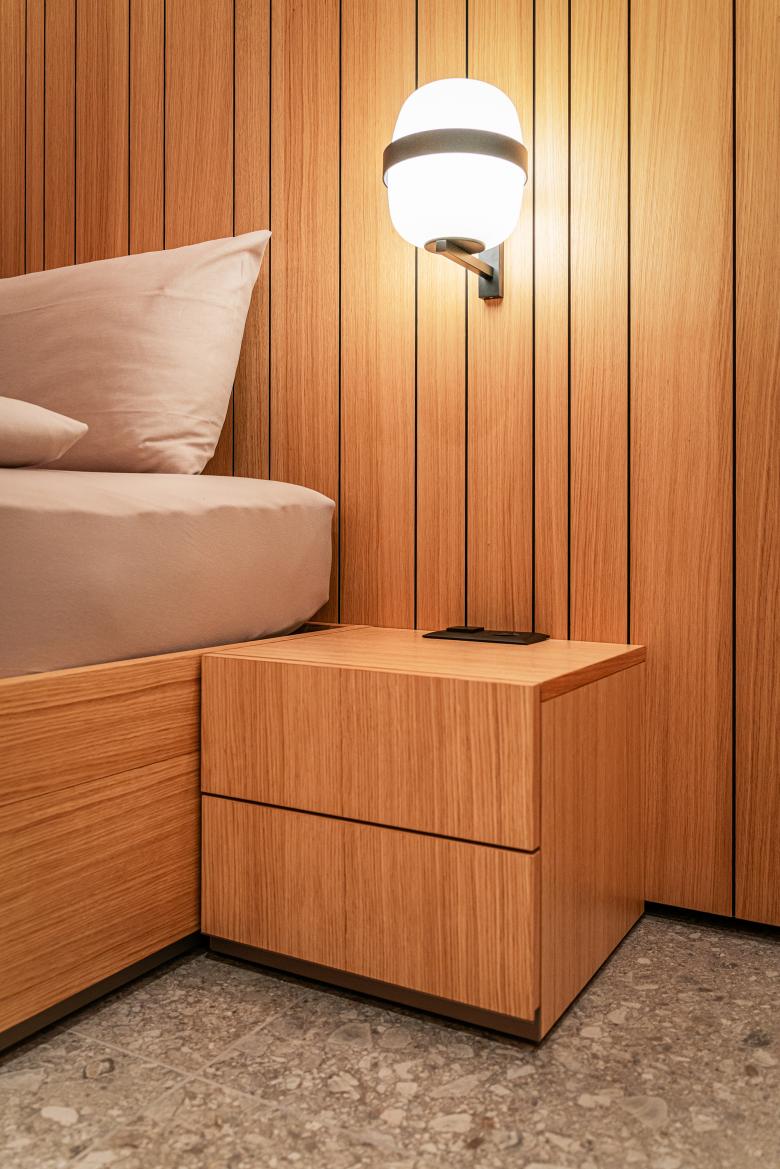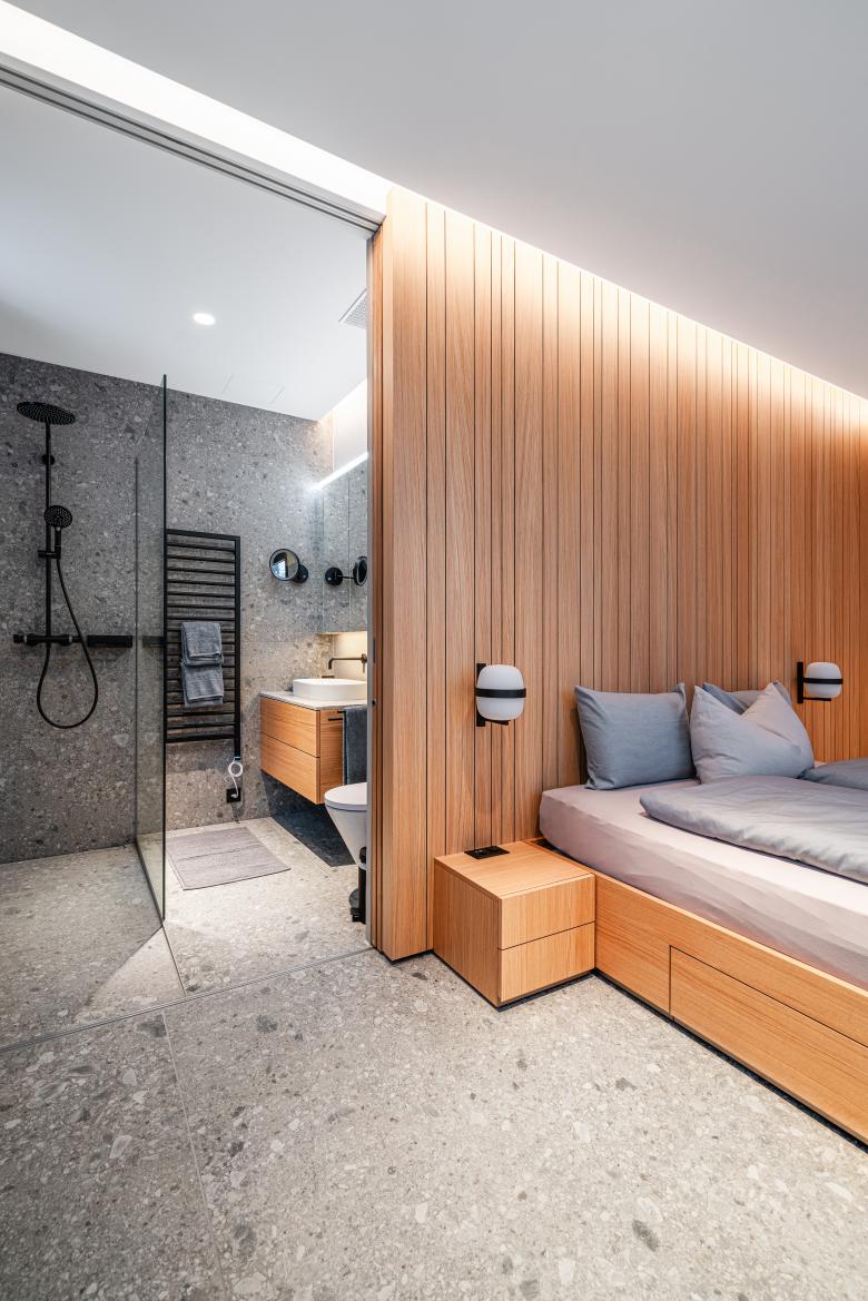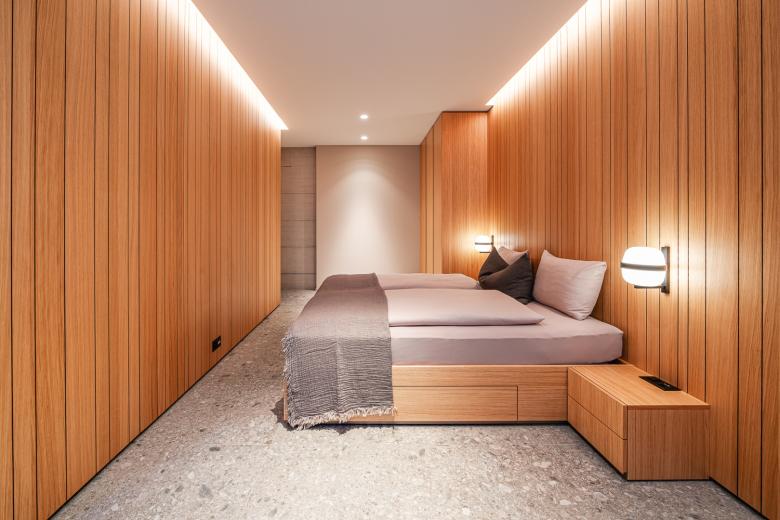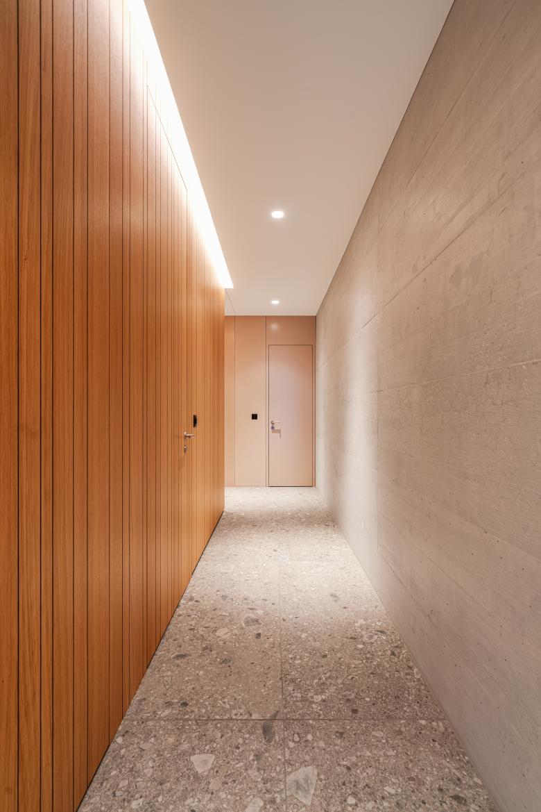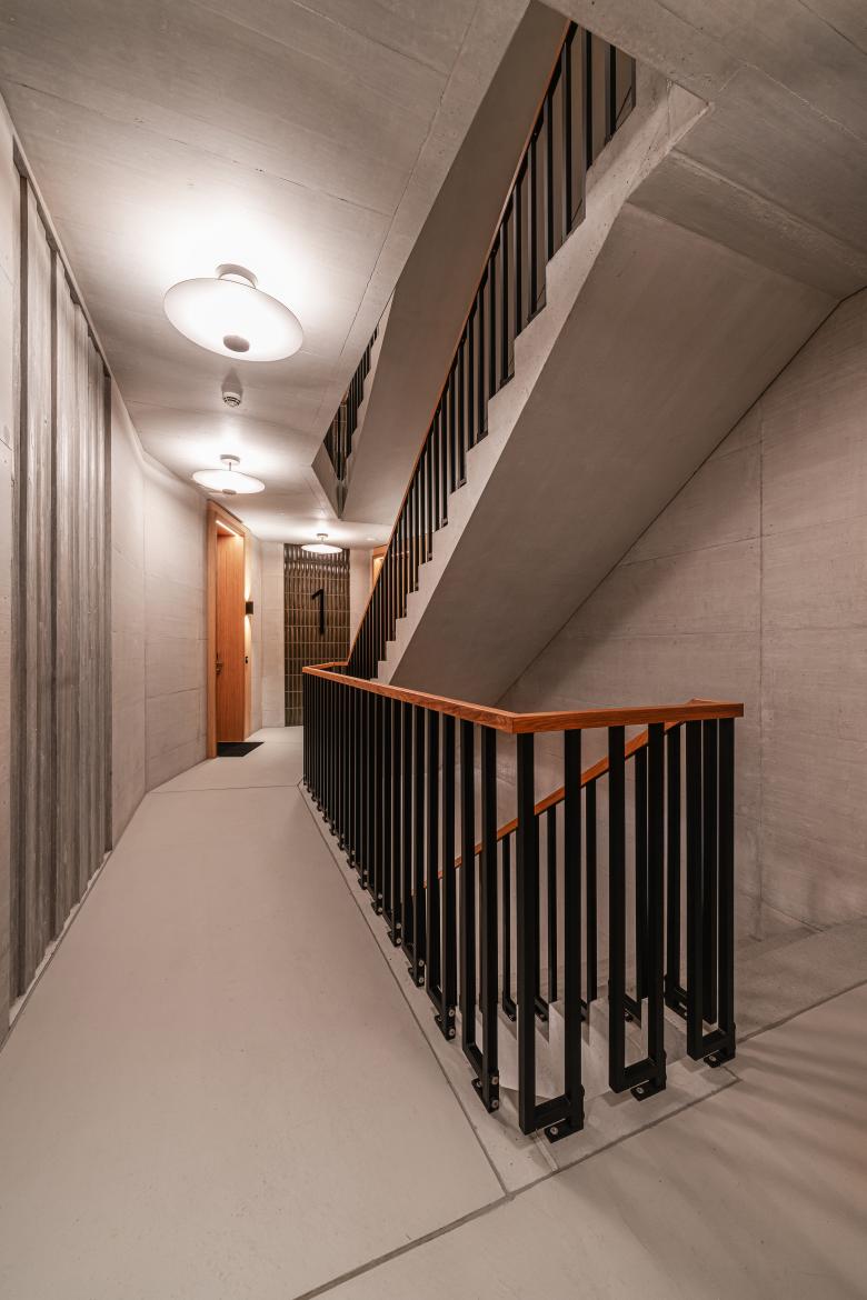 Privatsphäre wird in dieser dichten Umgebung wichtig und zeichnet sich in der Volumetrie und dem Verhältnis „offen zu geschlossen“ klar ab. Die Fensteröffnungen der Zimmer sind dadurch eher klein gehalten, und der Wohnraum in Richtung Platz und Gassenflucht geöffnet.