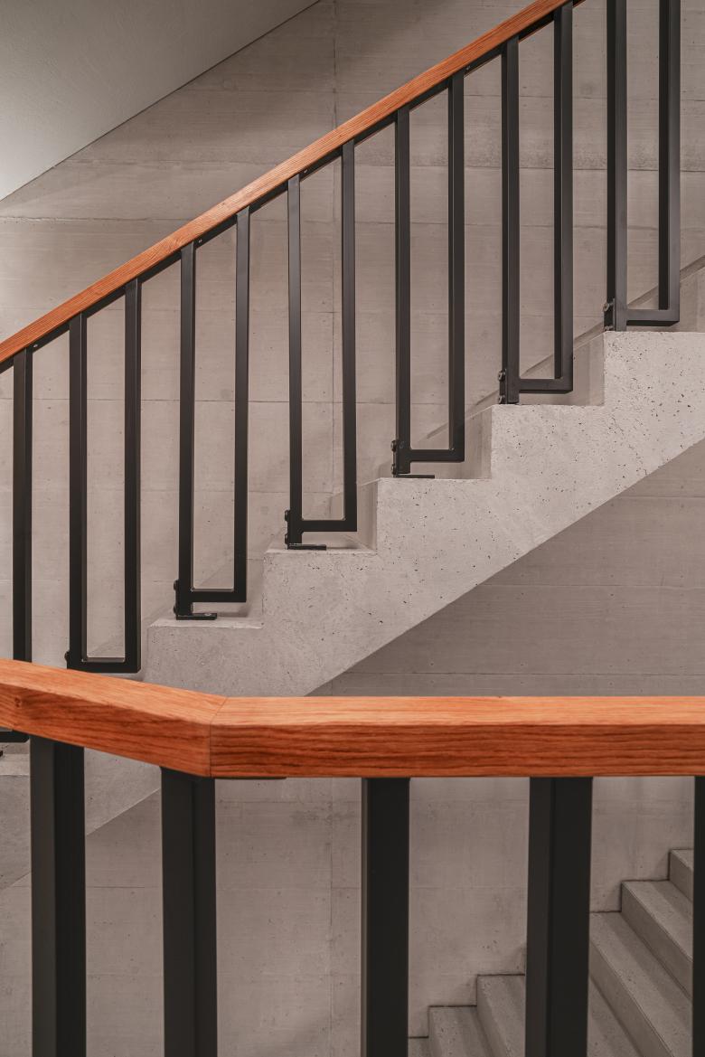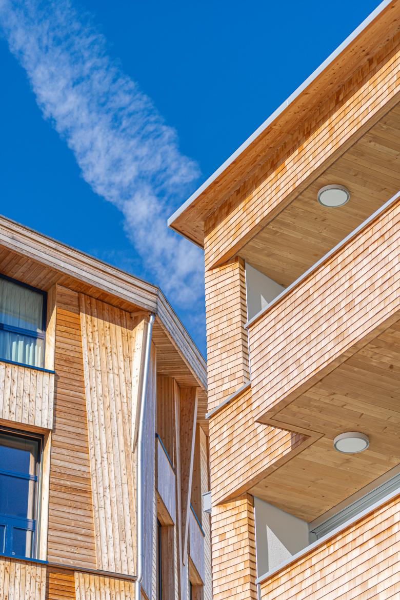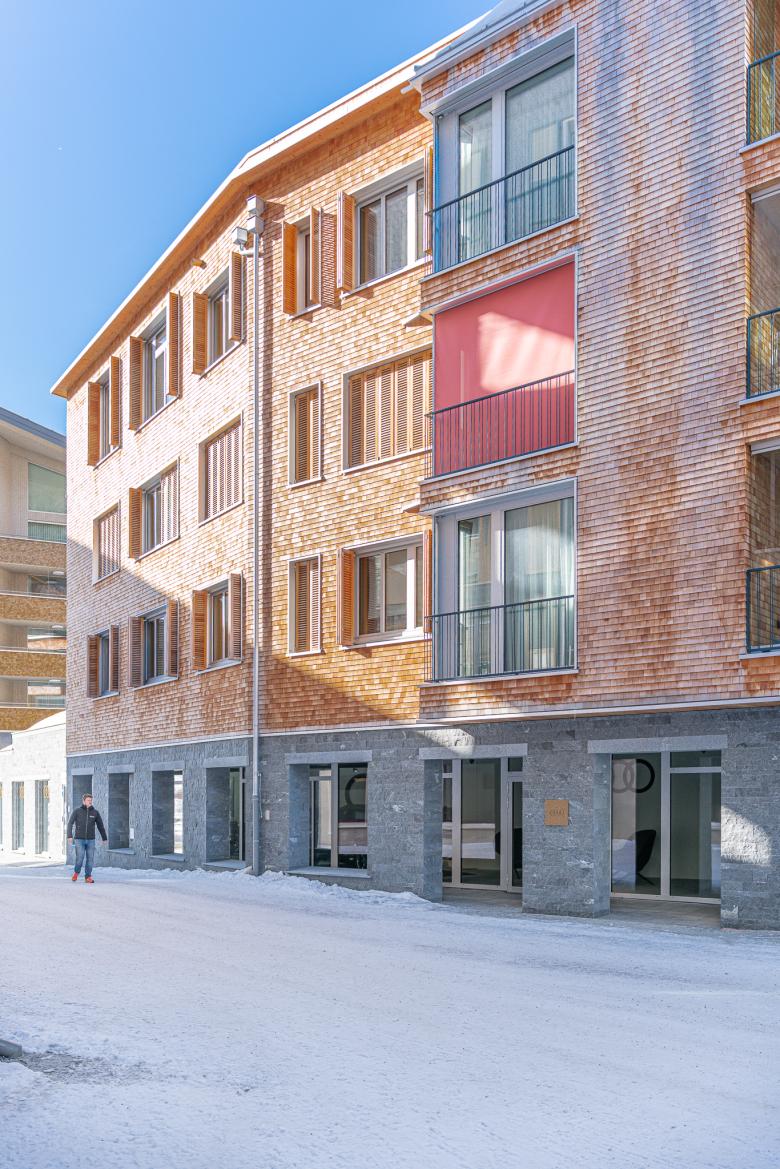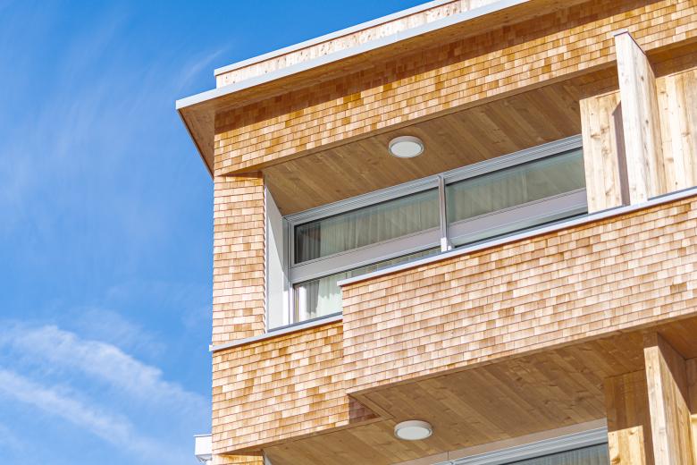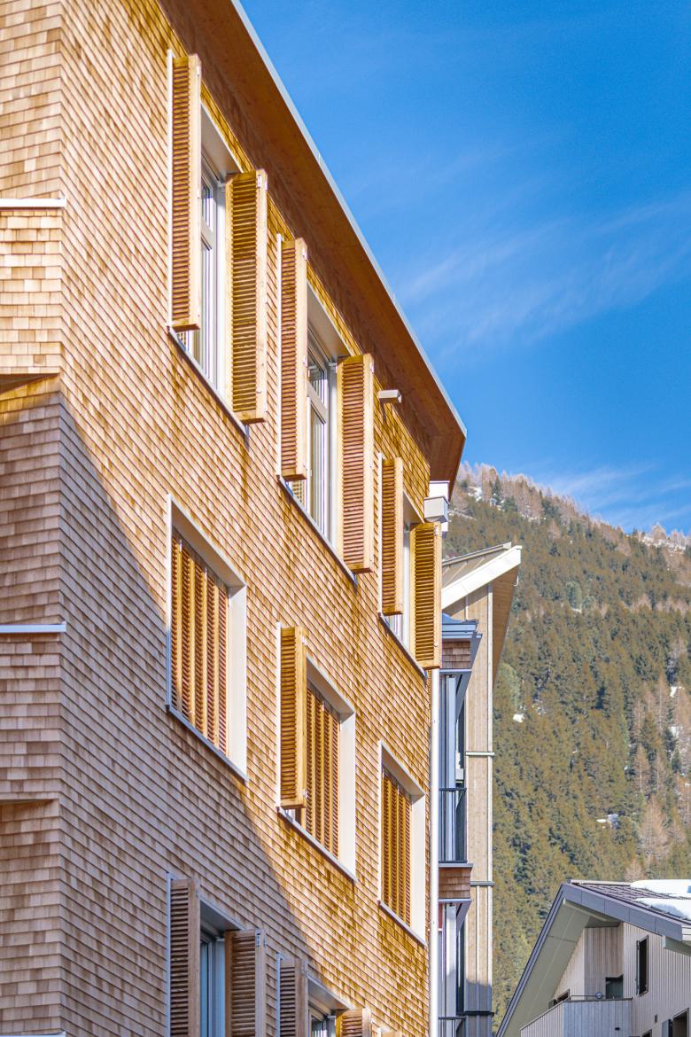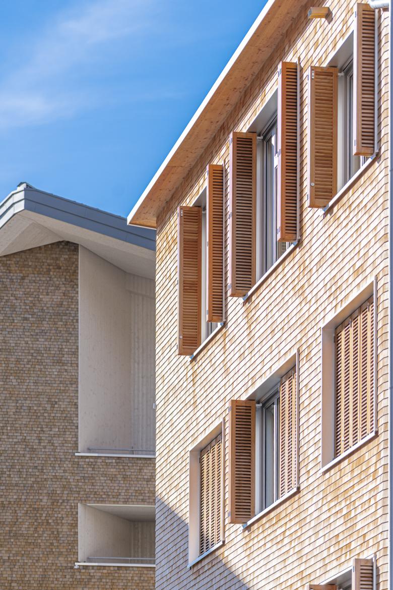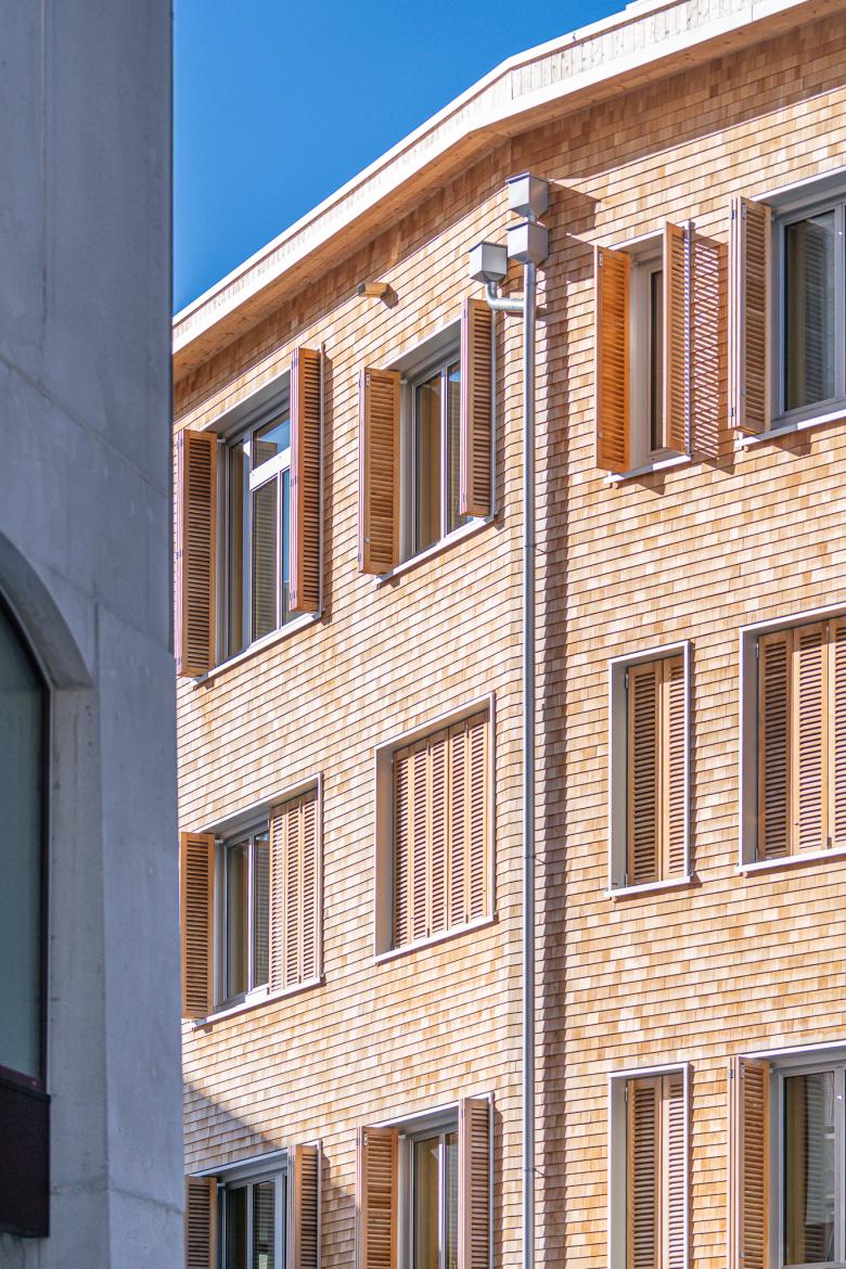 Die gewünschte nachhaltige Bauweise wird nicht nur im Innenraum thematisch aufgenommen, sondern zeichnet sich auch in der Materialechtheit der Fassade ab. Durch die typologische Bauweise mit Zedernschindeln wird der Baukörper eher ruhig gehalten und klärt den in der Höhe springenden Sockelbau. Ein flaches und vorspringendes Flachdach schliesst das Gebäude nach oben ab. Richtung Süden öffnet sich die Fassade im ersten, zweiten und dritten Obergeschoss mittels einer Terrasse und einem Balkon über die gesamte Breite.