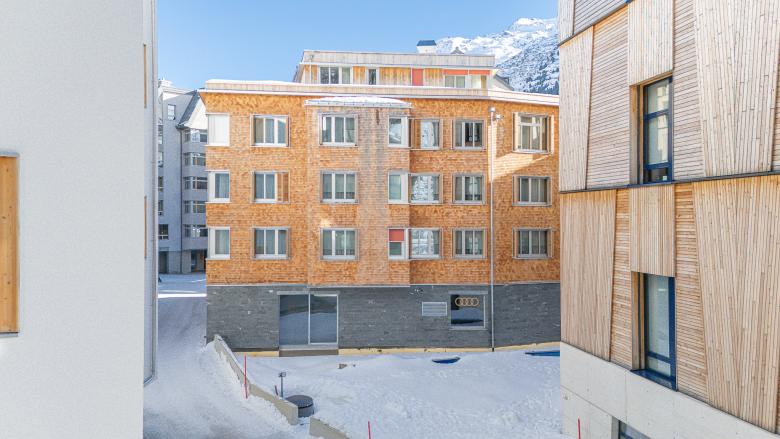 Der viergeschossige, im Vergleich zur Nachbarschaft, relativ niedrige Baukörper öffnet visuell die strenge Platz- und Gassensituation nach oben in die Berglandschaft. Dadurch wird die Dachaufsicht zu einem wichtigen Element des Gebäudes, da die meisten Nachbargebäude 2 – 3 Geschosse höher sind. Der intensiv begrünte Dachgarten mit Alpenrosen wandelt hierbei das Volumen zu einem Element der Umgebung.