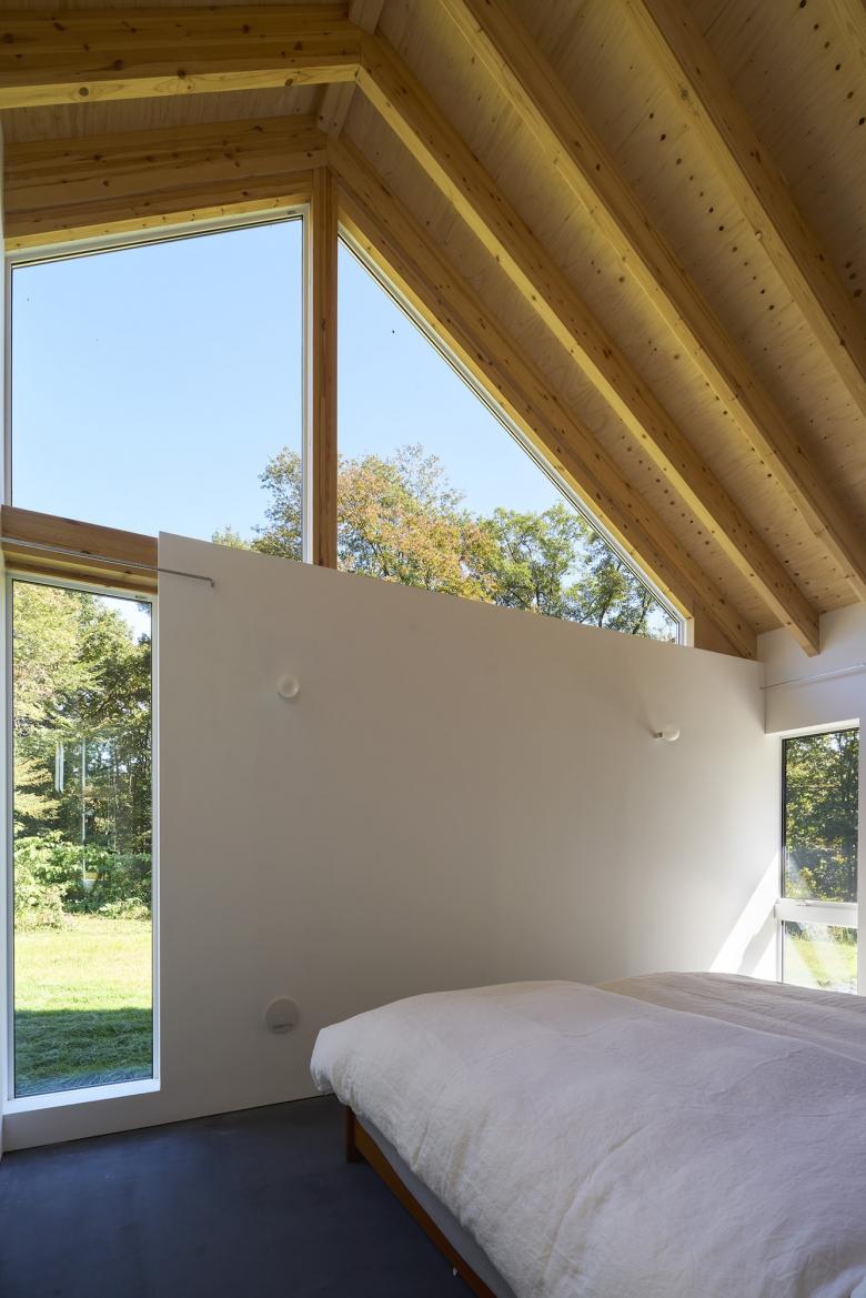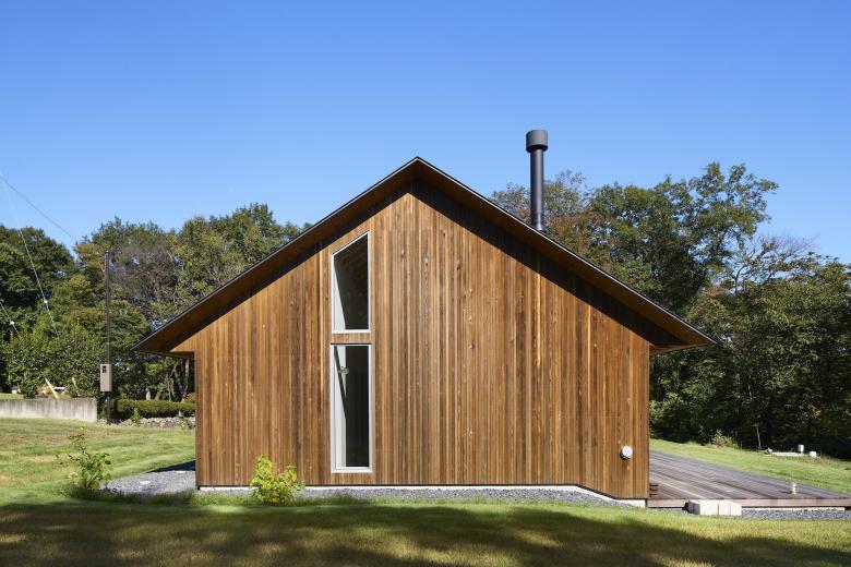 家庭菜園や庭の手入れ、雪かきなどに必要な道具を収納できるストレージスペースも設け、外部からは一見扉に見えない勝手口も用意している。温泉地に近い立地のため浴槽は設けず、シャワー室のみとした。薪ストーブは、薪さえあれば電気やガスに頼ることなく家全体を暖めてくれる。