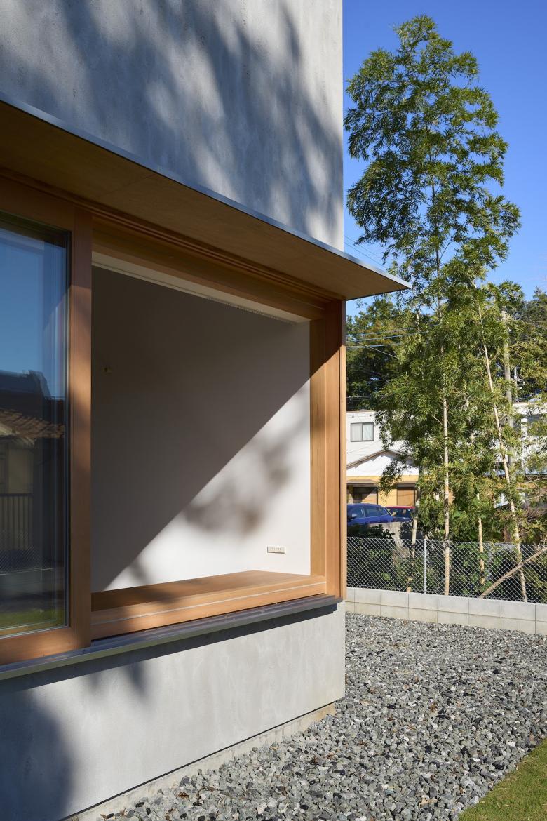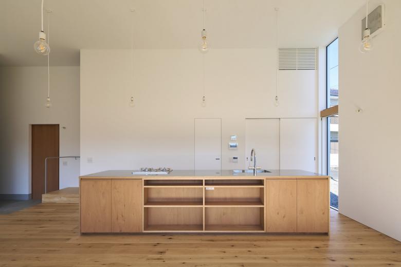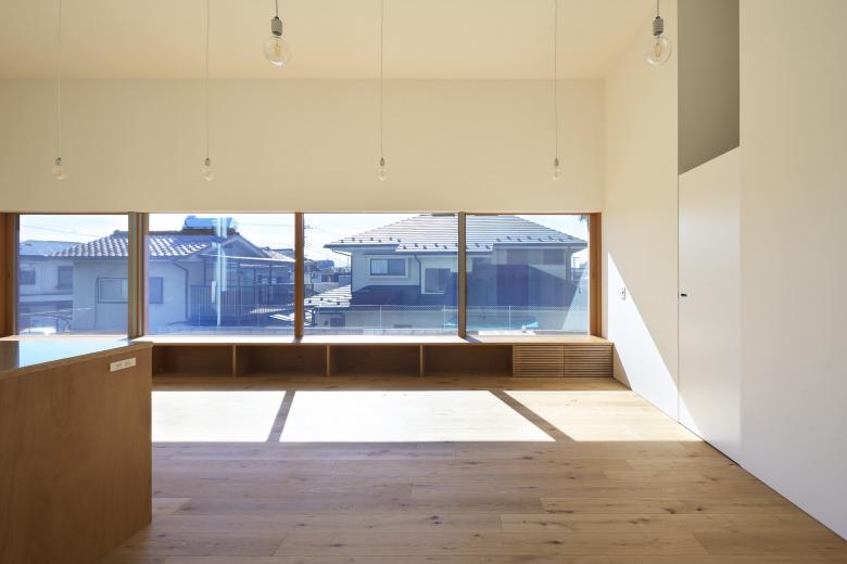 設計の自由度が制限される中で、本計画はあえてシンプルさを追求し、大胆な箱型のボリュームとなった。通りから見ると、ファサードには大きく張り出したカーポートの屋根が遠近感を強調しながら、来訪者を玄関へと自然に誘導する。玄関前には小さな桟橋が設けられ、扉を開けると家族が集う広々としたリビングが目の前に広がる。