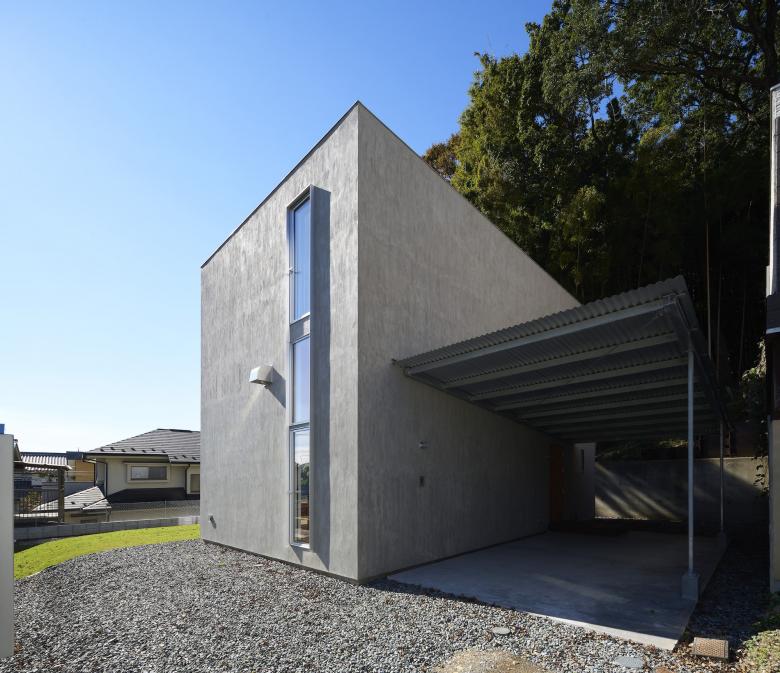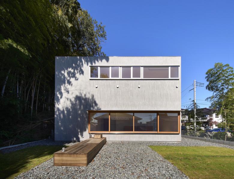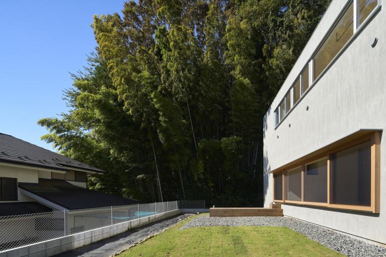 静寂な竹林を背景にひっそりと佇んでいる住宅。旗竿部分を除いた敷地面積は約300㎡。南東側の境界に最大2.5mの擁壁があり、崖条例の制限により建築可能な範囲は北西側に限定された。