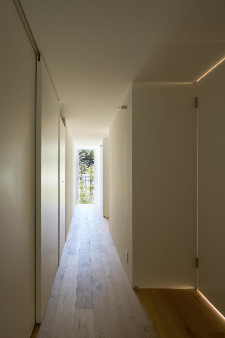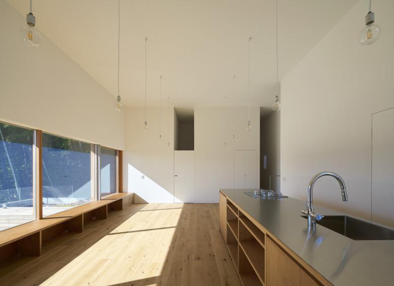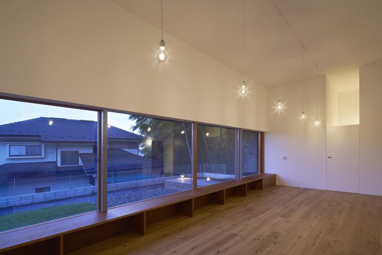 大開口からは広大な庭が望め、そこへ向かって長い桟橋が突き出し、内部空間と外部環境を視覚的につなぐ。一直線に伸びる階段は2階へと導き、2階の廊下は西側の竹林と東側の隣地の竹庭を切り取るように眺望を提供している。