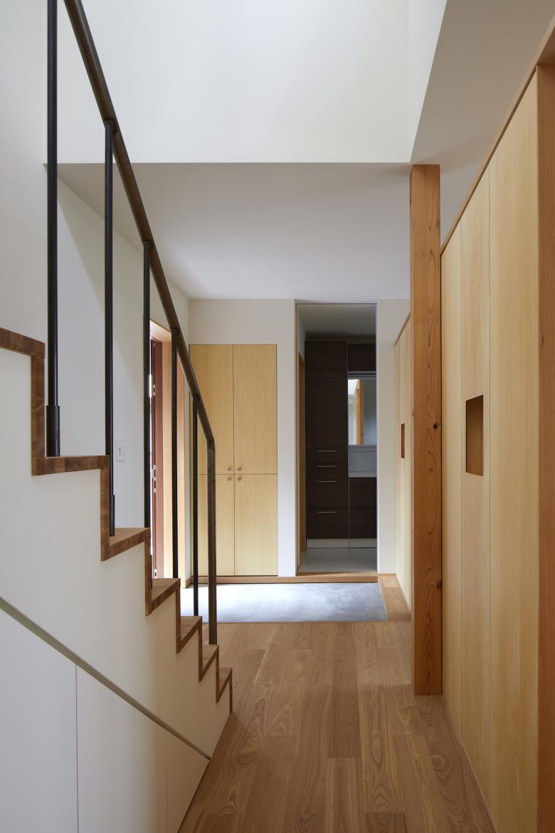 上下階をつなぐ階段の横に吹抜けを設けることで、住まい全体がひとつながりの空間となることを意識し、家中の何処に居ても家族同士がお互いの気配を感じられる様に計画した。