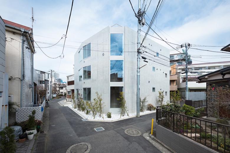 敷地の南側に接する道路は、かつてこの一帯を蛇行して流れていた旧神田川の暗渠である。この自然河川は、治水の必要性もあり近代的な整備が行われ、若干位置を変えて南北に伸びる直線状の人工的な河川となった。代わりに元の河川は埋め立てられて細街路となり、周辺は宅地化された。見通しの効かない細切れの街路空間が連なる街並みは、身体に馴染むような感覚を覚え、近代化された街区とは異なる特徴と言える。本プロジェクトは、このようなエリアの一画の不定形な敷地における集合住宅の計画である。