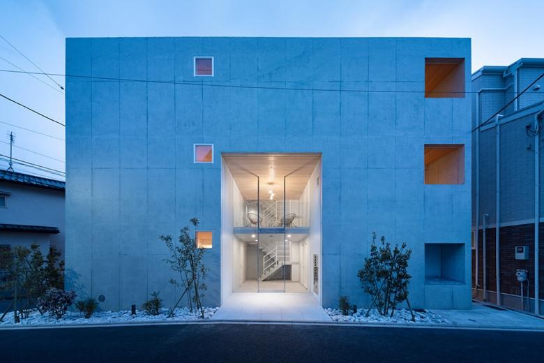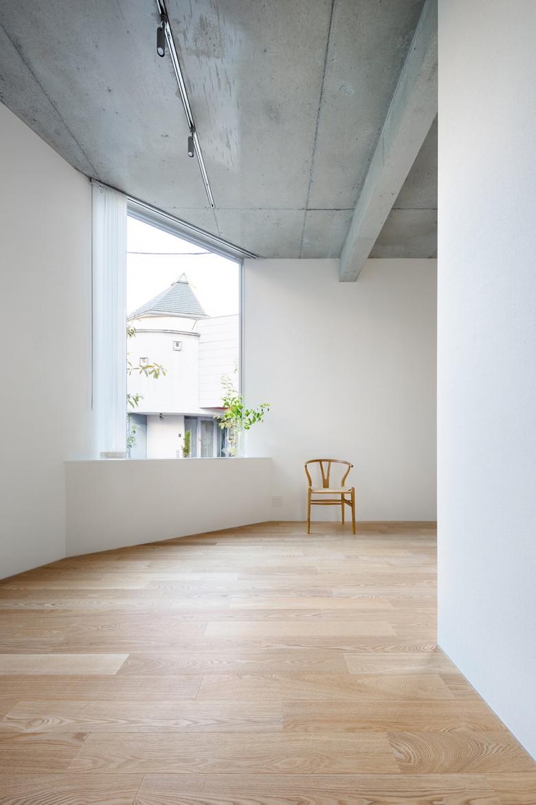敷地の輪郭をオフセットして平面の外形を決め、3方道路に囲まれた特性から、方向性を持たない井の字型の壁を設定した。これを一枚の壁で囲み、北東・南東に伸びた道路に対して壁を切断して角を取った。屋内から視線が抜けるように、また小さな広がりを得た外部スペースに植栽を植えて緑の街なみをつくり、各々の道路からのアイストップとした。
