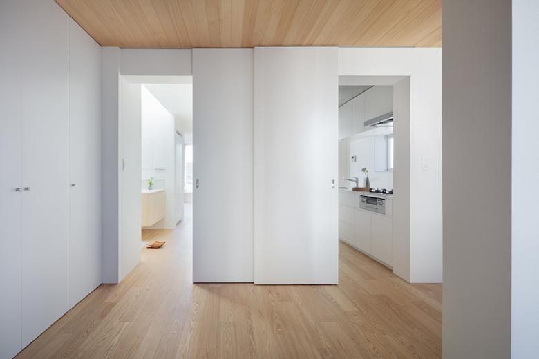共用部は、6種類の白色を用いて仕上げ、各階で自然光を取り込むことで、川霧の中にいるようなぼんやりと明るい空間を目指した。