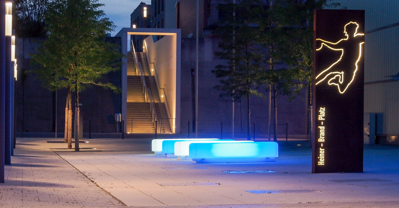 Die Kampstraße bildet innerhalb des Stadtgefüges den Auftakt der dynamischen Achse. Diese Achse bildet eine spannungsreiche stadträumliche Abfolge mit unterschiedlichen Teilsequenzen: die Neuplanungen des Heiner-Brand-Platzes mit dem Umfeld der „Schwalbe-Arena“ und der kulturell, schulisch und gastronomisch genutzten Halle 32, die auch von der Fachhochschule Köln Campus Gummersbach genutzt wird, der innerstädtische Bereich der Kampstraße und die Anbindung an die bestehende Fußgängerzone. Für alle Neuplanungen werden Materialien, die typisch für das Steinmüllerareal sind, verwendet. Darüber hinaus wurde als Zeichen der Erinnerung an die industrielle Historie des Steinmüllergeländes ein „glühender Ring“ aus Cortenstahl an prominenter Stelle als zentraler Verteiler des Geländes positioniert.