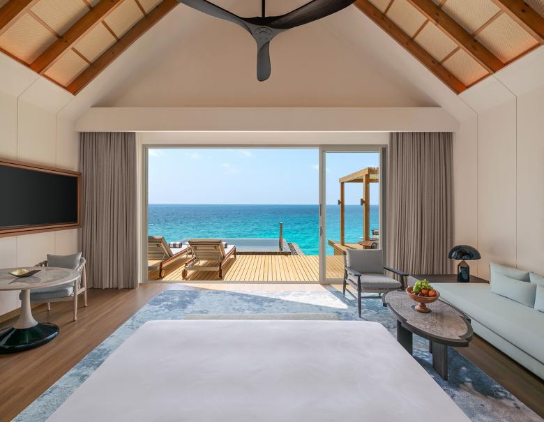Das Architekturbüro Atolye4N entwickelte für das Projekt eine Formensprache, die sich bewusst an traditionellen Bauformen der Region orientiert. Der Ankunftssteg, inspiriert vom Flugbild des einheimischen Maakana-Reihers, markiert den gestalterischen Auftakt der Anlage. Jede Villa verfügt über großzügige Terrassen, einen unverbaubaren Blick auf den Indischen Ozean und Zugang zu unberührten Lagunen. Die Gebäude nehmen Bezug auf die traditionellen maledivischen „Gedhoru“-Hütten mit ihren Kajandächern und leuchtend türkisfarbenen Türen, greifen aber gleichzeitig moderne Gestaltungsprinzipien auf. Raffinierte Anspielungen auf die maledivische Handwerkskunst fügen sich nahtlos in das Design ein und schaffen einen ruhigen und harmonischen Rückzugsort. Die Villen selbst zeichnen sich durch eine reduzierte Formensprache aus, die durch natürliche Materialien wie Holz und Stein als Hommage an die raue Schönheit des Inselstaates ergänzt wird. Bodentiefe Verglasungen öffnen die Räume zur Umgebung und lassen Innen- und Außenraum optisch und funktional miteinander verschmelzen. Freiluftduschen und private Pools schaffen auch innerhalb der geschützten Anlage eine intime Oase. In diesem klaren und ruhigen Interior Design setzen Schalter der Serie LS 990 von JUNG in Aluminium lackiert dezente Kontraste im präzise gestalteten Interieur. Darüber hinaus kommt im Resort ein KNX-System von JUNG zum Einsatz. Es übernimmt Funktionen der Gebäudeautomation und wird unter anderem als Gästezimmer-Managementsystem eingesetzt. Licht, Klima und andere Komfortelemente lassen sich damit bedienerfreundlich und energieeffizient steuern.
