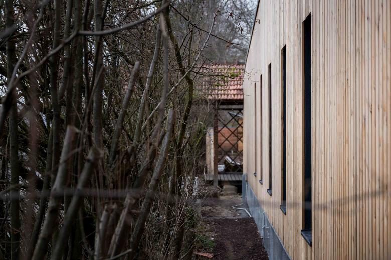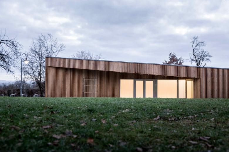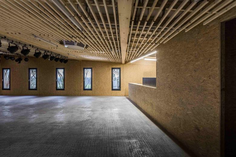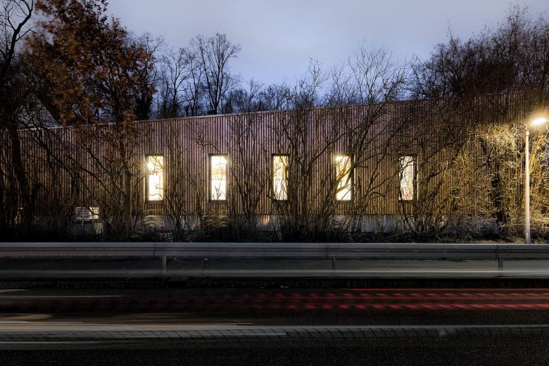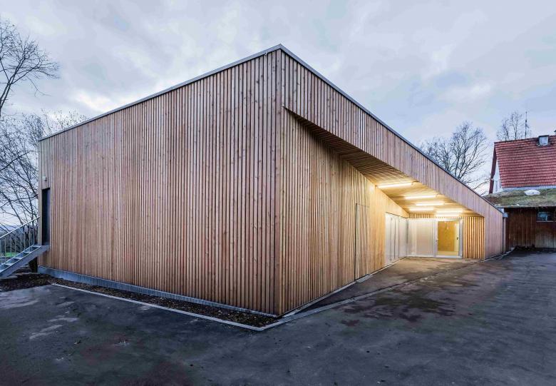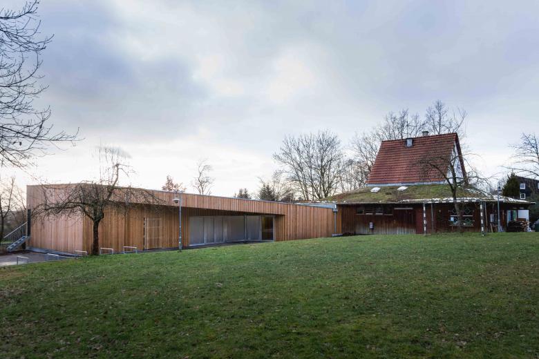 In bester Tradition des Hauptbaus von Peter Hübner entstand ein Ersatzbau für die marode Veranstaltungshalle des Jugendzentrums Zinsholz in Ostfildern. Der neue, klare Baukörper in Holzrahmenbauweise steht auf dem Bestandsfundament. Die Konstruktion beschränkt sich auf das Nötigste und entwickelt ihre Ästhetik aus dem offenen und naturgemäßen Einsatz der verwendeten Materialien: OSB und Lärchenlatten, blankes Aluminium und roher Estrich.