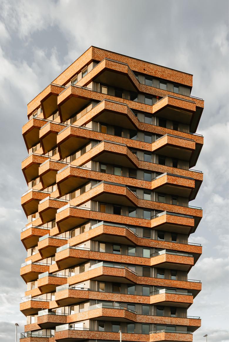 The façade is crafted from bricks made with clay drawn directly from the nearby riverbanks, rooting the building in the landscape and deepening its local identity. Its color palette harmonizes effortlessly with the neighboring structures, reinforcing the visual rhythm of the buildings across the floodplains. Yet, amid this harmony, bold accents in warm, glowing tones catch the light – subtle but striking touches that give NELSON its own unmistakable presence.