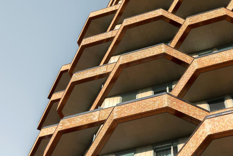 The dynamic shift in balconies is possible by varying the floorplans. This flexibility is created by having a diamond-shaped structural core that mirrors the load bearing façade. The layout is designed to remain flexible, as everything between the core and the façade can be reconfigured, should future demand arise. Adaptability is thus a key part of the design, while always maintaining high- quality floorplans with balconies connected to the living spaces. Comprising 93 units, the apartment configuration varies per floor from affordable housing on the lower levels to open plan penthouses at the top.