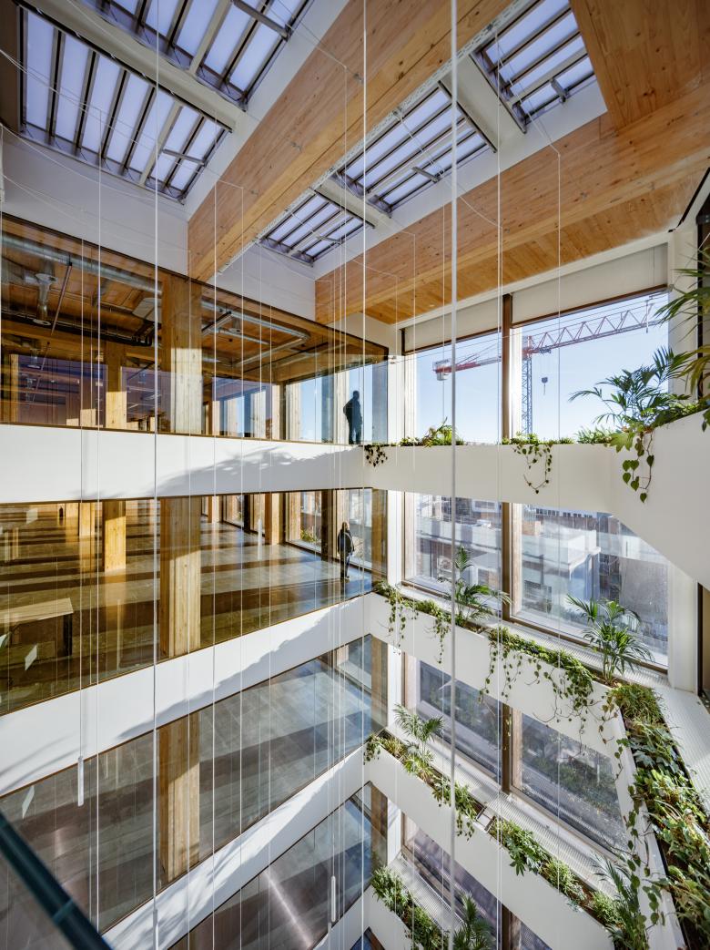 The building’s form is organised in a U-shape, enclosing an inner garden accessible from the exterior via a double-height porch. This landscaped area, acting as a green lung within the city, enhances environmental quality and fosters a closer connection between users and nature. The structure rests on a robust concrete base with large spans, allowing for generous, flexible interior spaces. Above this base, the office floors are constructed using timber, a renewable material that promotes a healthy and environmentally friendly working environment.