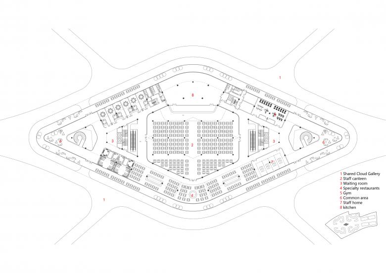 Comprehensive Service Supporting Room - is a shared comprehensive supporting space integrating park support, technical service platform, crowdsourcing exchange, catering and entertainment, fitness and sports, and cultural activities. The technical service platform is located in the shared head, which not only has a free large space, but also a dynamic cloud corridor space. It is functionally divided into three floors with a total area of about 21,000 square metres. The ground floor is a comprehensive exhibition hall, displaying new products developed under bond in a multi-angle and all-round way; the first floor is for live exhibition and trade and comprehensive management, with different camera angles to open up a full-angle trade perspective; the third floor is for comprehensive services, which can satisfy the catering, leisure, fitness and multiple needs of more than 5,000 people in the park.