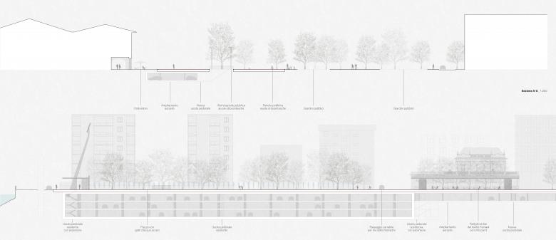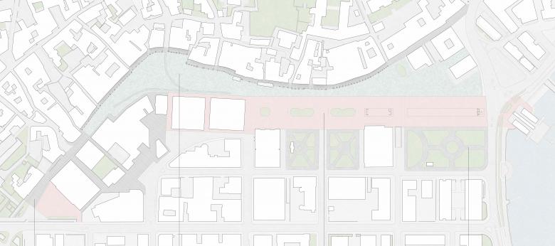 Il concetto proposto prevede un elemento rettangolare che conclude il Piano Rusca verso l’antica riva sinuosa: un nuovo boulevard che si posa come un tappeto rosso al limite del ciottolato della vecchia riva definendo un preciso limite tra le due tipologie.