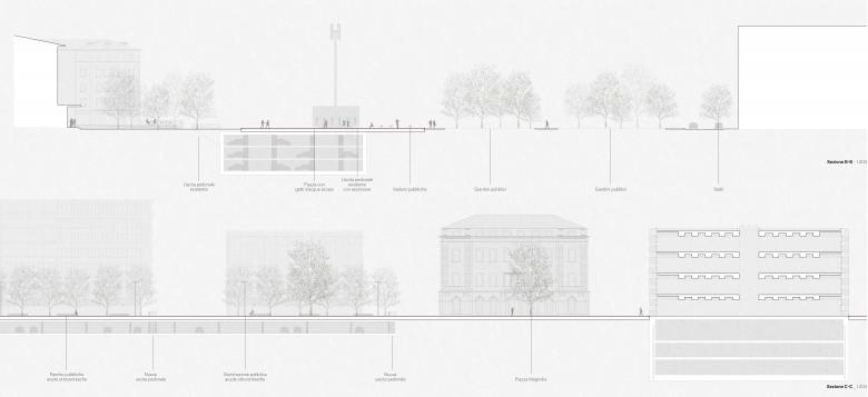 Il tappeto rosso inizia come basamento dell’edificio della Posta e della Sopracenerina, continua in un boulevard con una spina dorsale che ospita le aiuole dei giardini Rusca, un padiglione di fronte al teatro, una grande fontana e gli accessi all’autosilo.