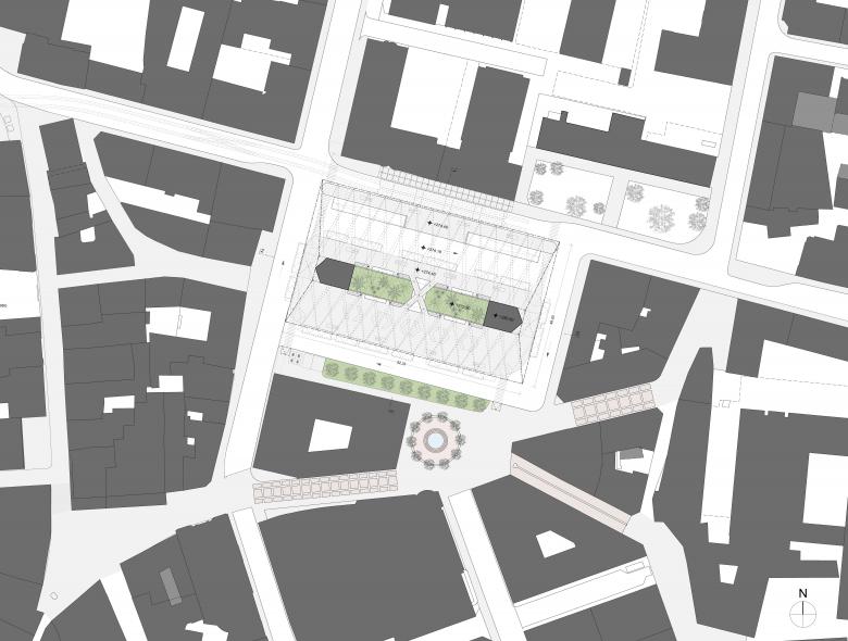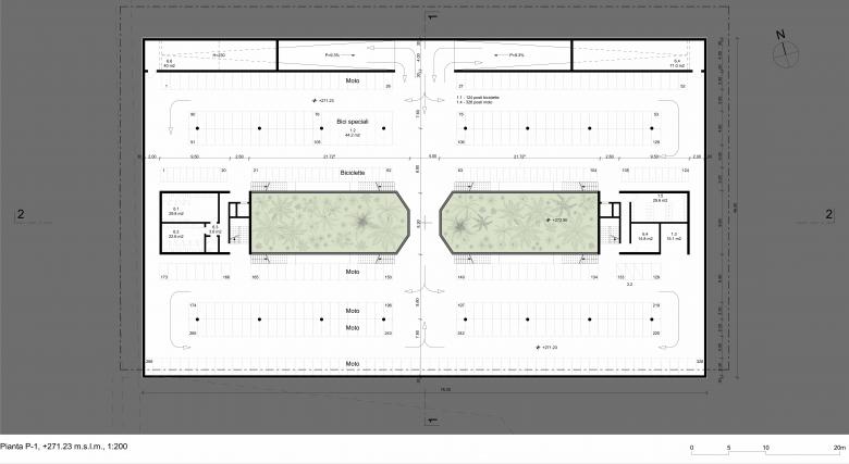 La copertura di forma parabolica su 4 lati è di legno, composta da una struttura primaria di travi curve intrecciate, in modo a creare un “tessuto”, e da una struttura secondaria composta di travetti e ricoperti da un assito, formando uno spazio accogliente. La struttura lignea che forma lo spazio è sorretta da una struttura centrale in acciaio, un traliccio 3-dimensionale, appoggiato su due volumi in cemento armato. Mentre la copertura lignea è impermeabilizzata e protegge dalla pioggia, la corte centrale è aperta verso il cielo, ben visibile dalla piazza grazie alla forma parabolica. I muri dell’area verde sono inferiori rispetto alla piazza, a livello della quota di falda massima, in modo a garantire da un lato la funzionalità di vasca bianca del posteggio dall’altro dare alle piante la terra naturale e garantire l’infiltrazione dell’acqua piovana.