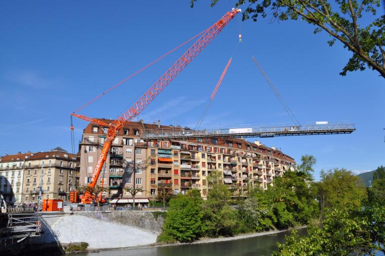 De plus, afin que le pont puisse être franchissable par les vélos et les piétons durant les travaux, il a fallu tout d’abord réaliser une passerelle provisoire d’une longueur totale de 77 mètres accessible à tout type de mobilité douce.