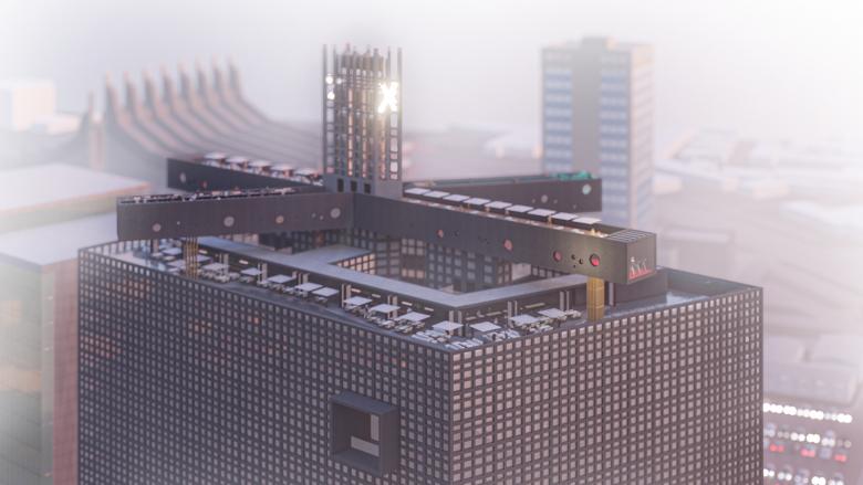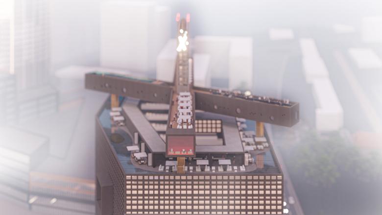 The morphology of our building takes shape around the setbacks and height restrictions dictated by the authorities. The deep slabs of the base accommodate flexible retail space along with carefully planned public pedestrian circulation, private residential cores and vehicular ramps. Above those are the modularly office units, which also occupy the relatively deep slabs of the structure. The higher plateaus in which the residential and hotel components are disposed around an eight stories high internal void / courtyard, which includes the hotel sky lobby. Above the body of the building, an X shaped bridge houses a gym / spa, and a sky bar / lounge on its roof. This “crown” exceeds the 50 meters height restriction and is given a special approval by the municipal authorities, which consider it an exceptional urban destination that will positively animate the urban fabric. The tip of the facades of the roof installation feature oversized frames / windows providing spectacular views of Pristina. Each frame pointing towards one of the preferred orientations celebrates each of the activities performed inside, such as the 5 x 5 meters aquarium like frame pointing east, behind which swimmers can be seen in floatation animating the skyline of the city.