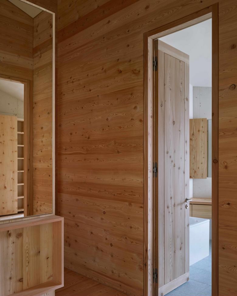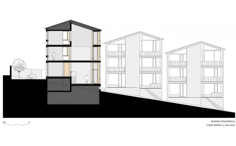 Un grande spazio traversante costituisce l‘elemento caratterizzante la tipologia abitativa e richiama il „suler“ tipico della casa engadinese tradizionale. Le camere si trovano in due corpi di legno più intimi e introversi. La pianta è flessibile e prevede di avere un solo grande appartamento su un piano con due zone notte, una padronale e una per gli ospiti, oppure due appartamenti per piano.