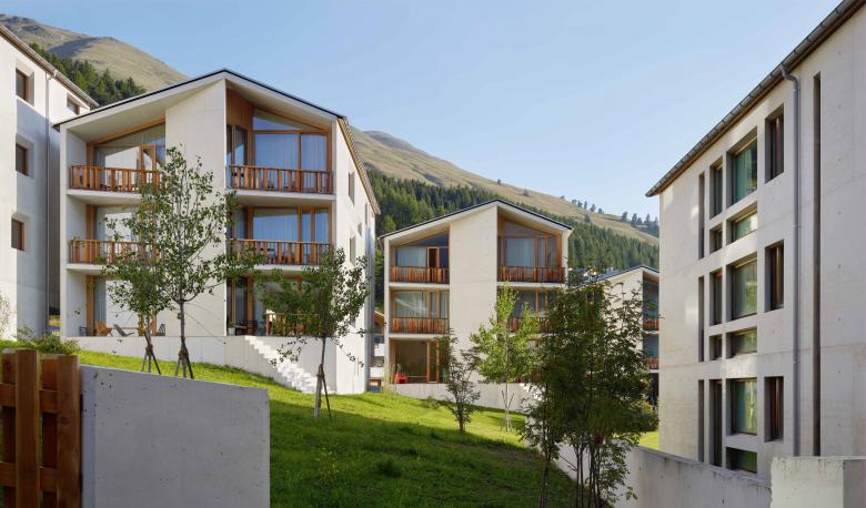 La „Chesa Mariöl“ 1, la prima di una serie di sei case d’appartamenti previste dal piano di quartiere è annessa al nucleo del villaggio ed è dunque la più importante per la sua posizione rispetto alla sequenza di piazze. L‘edificio non si orienta verso il sole, ma lungo l‘asse est-ovest, godendo in tal modo gode di una bellissima vista sul Piz d’Esan a est e sul Piz Mezzaun a sudest. Le Chesas Mariöl 2 – 6 si accostano alla via Mariöl e godono dell’esposizione a sud e del parco – giardino comune. La posizione a gradino permette un’indipendenza nonostante la vicinanza delle case.