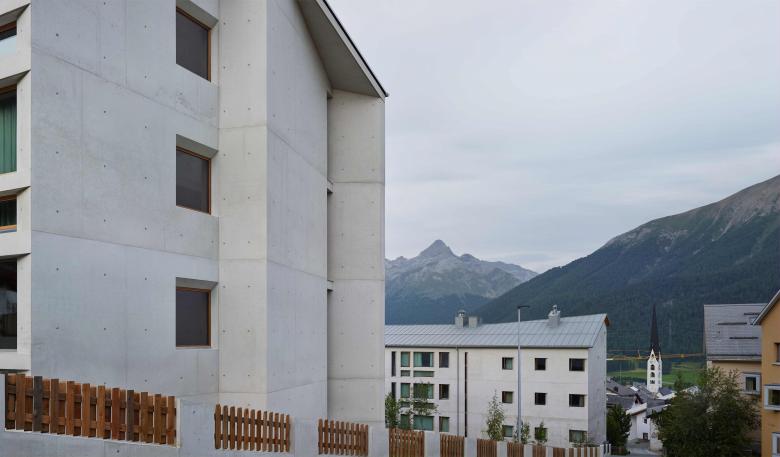 Le facciate rispecchiano la pianta: grandi finestre panoramiche in corrispondenza al soggiorno e finestre più piccole in corrispondenza alle camere. Gli edifici presentano una marcante conformazione plastica, conferitagli dallo spessore delle aperture e dal forte carattere murario del volume bianco. L‘edificio tematizza in parte elementi del luogo, soddisfa però anche le moderne esigenze in termini di luce, vista e spazio. Le facciate e i muri interni del soggiorno sono di cemento bianco, materia che riesce a riprendere la plasticità delle straordinarie case vecchie del nucleo.