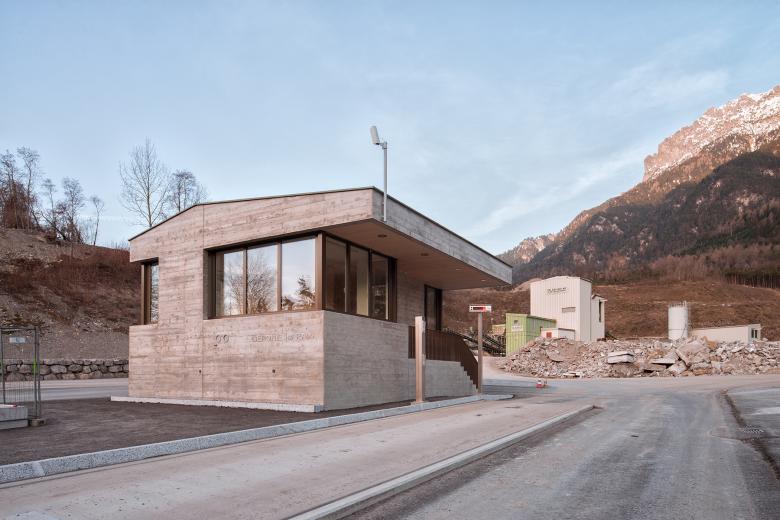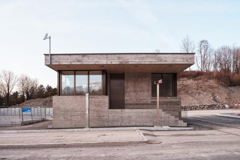Der Neubau der Deponiewarte ist Teil des Gesamtprojektes der Neugestaltung der Deponie im Rhein. Umgeben von Wald, Steinbruch und Kieswerk steht der Monolith aus Sichtbeton selbstsicher an seinem Platz.