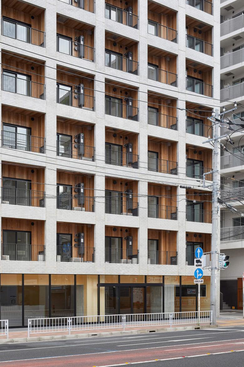 1Fのコンビニエンスストアは半分地下に埋めることで、商業施設に必要な階高を確保しながら、上部の住宅部分の外壁モジュールにも合うように調整し、商業施設と住宅がファサードの中で分離しない防火帯建築のような構成となっている。