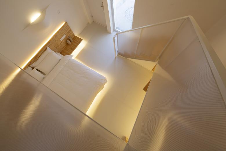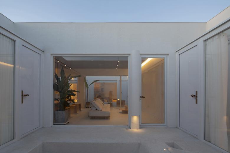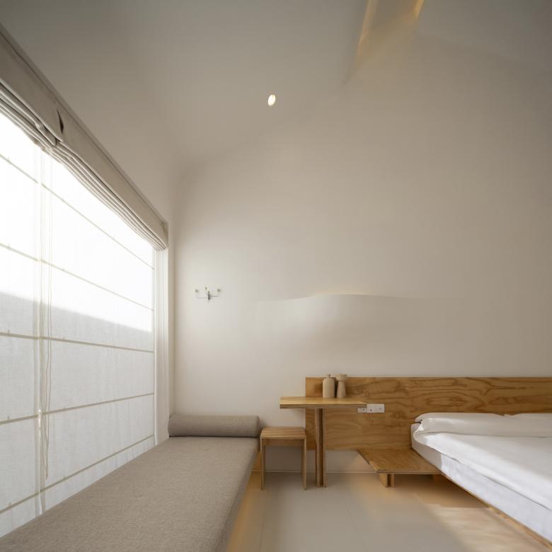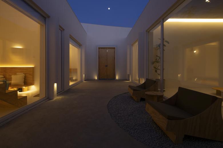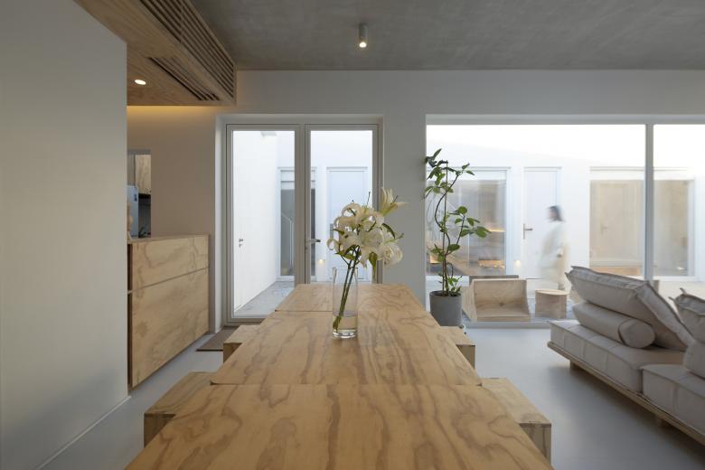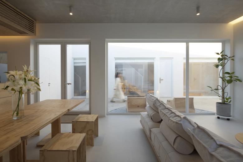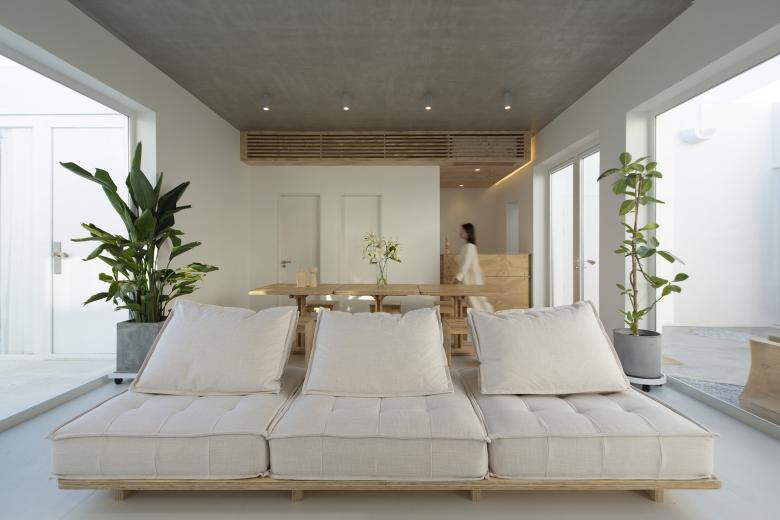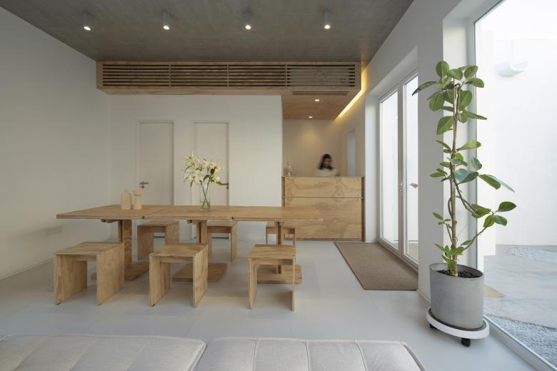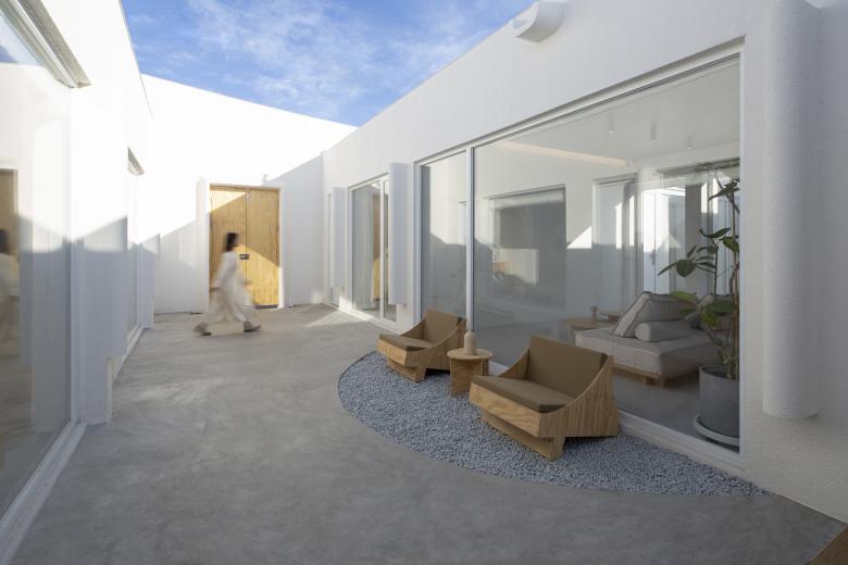 两个院子原本就存在于建筑之中,皆给人以内向宁静的氛围。我们将前院定义为开放空间,左右两侧的建构形式对称且有秩序,塑造出了极具精神性的纯白院落空间。后院则相对封闭,主要为客人提供一个具有一定私密性、可供放空发呆的室外活动空间。而大厅空间成为了连接前后两个院子的媒介,大块透明的落地玻璃面使光和视线得以贯穿。
