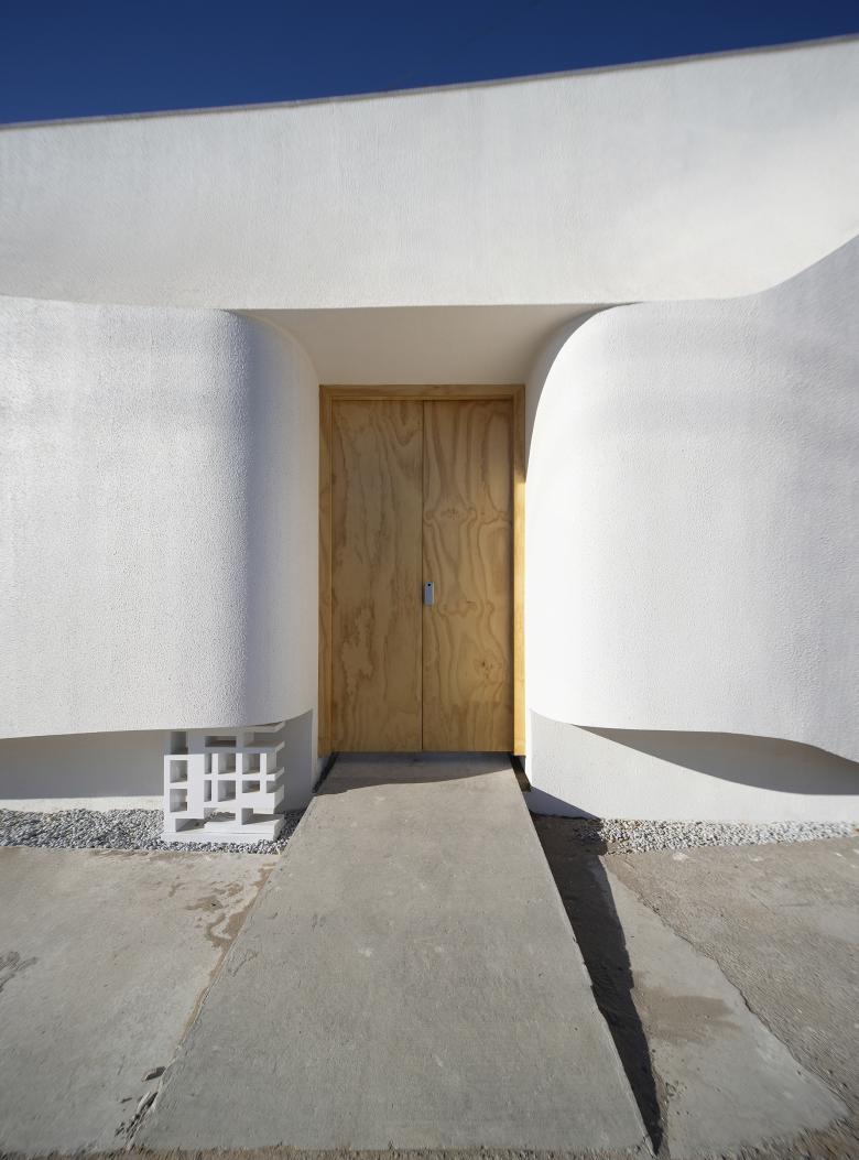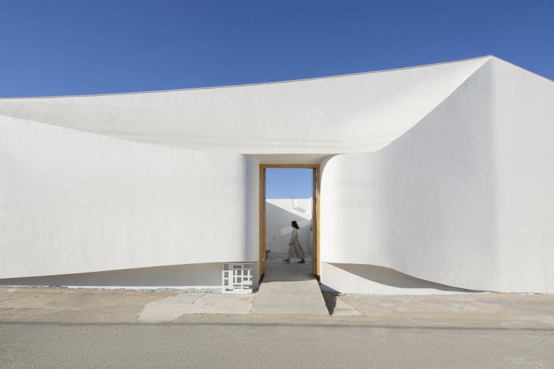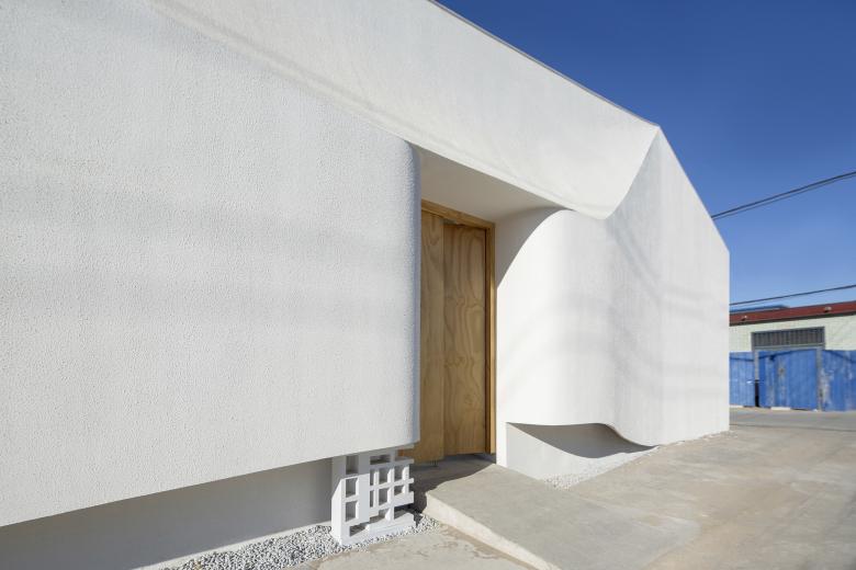 在我们的设计中时常强调三个关键词,流动、衔接、延伸。几何体量流动的关系,以及建筑在场域中的气质,一直是我们的关注重点,也是我们的设计惯性,这种惯性是无意识的并且随着时间在不断转变。起初,建筑外墙的沿街立面凌乱不堪,平顶与坡顶房的山墙面生硬拼接,呈现出随意、单调的沿街景象。为扭转这一局面,重塑位于主要路口建筑的形象,赋予其体量感与可辨识度,我们进行了深入的推敲。先是给予建筑一个微微向前的力,并以入口门洞的四个角为起点向四周延伸至建筑的边缘,塑造出全新的结构线,随后将这些线条柔化,形成一个内凹形的入口灰空间,使扁平的墙体有了几何雕塑感,静态的建筑有了流动感。这个充满流动感的入口,既实现了雨棚的功能,又不见雨棚,完美地融入到了建筑的身体。而这些流动的线条与一望无际的白色,为建筑赋予了诗意与惊喜之感
