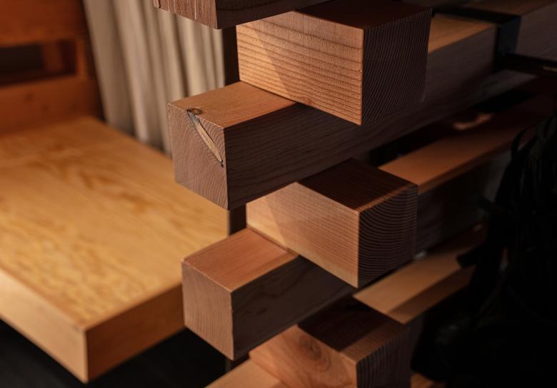 Upon entry, visitors are greeted with a double-height, hand-painted mural of the Snow Peak founder, Yukio Yamai. Conjuring an earthy and woodsy atmosphere, materials such as dark stone, wood flooring, hand-troweled concrete, wood paneling, and custom wall coverings were chosen for the first level. Century-old Douglas fir beams were milled and stacked into a unique wall retail fixture system in a contemporary, American-inspired nod to traditional Japanese wood building methods.