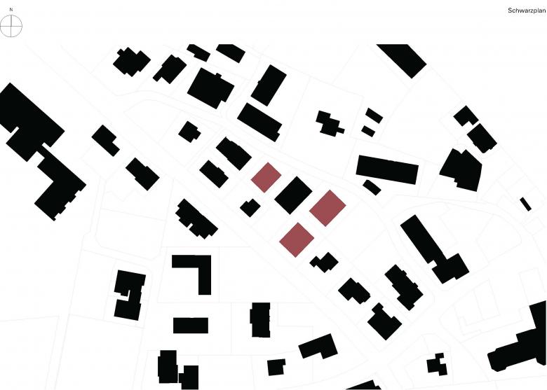 Die Volumen nehmen in ihrer Setzung den Strassenraum auf und fügen sich in den Freiraum zischen Bauten und dem Giessen. Eine gemeinsame Aussenraumgestaltung unterstreicht die Einheit im Aussen und die Idee des Gestaltungsplans. Auch in der Fassadengestaltung soll für die neu entstehenden Häuser ein einheitliches Bild gefunden werden. Die drei projektierten Gebäudekörper sind autonom und unterscheiden sich durch die Grösse und Anzahl der Wohnungen.