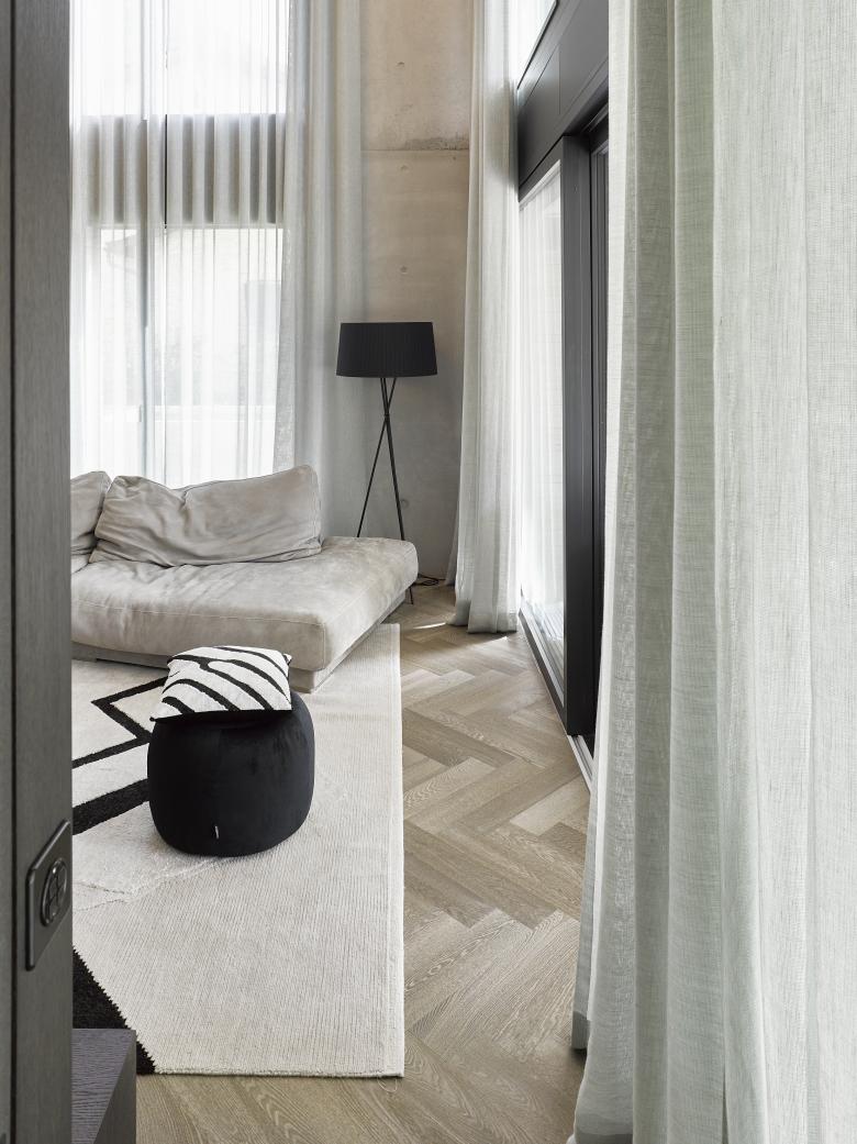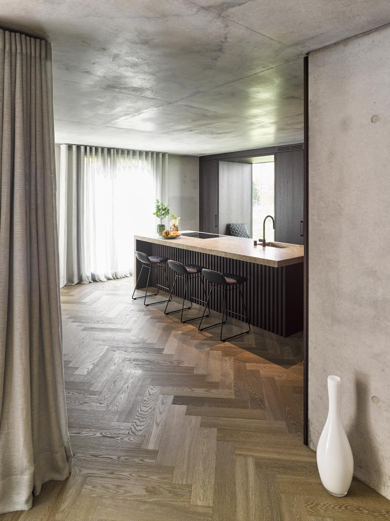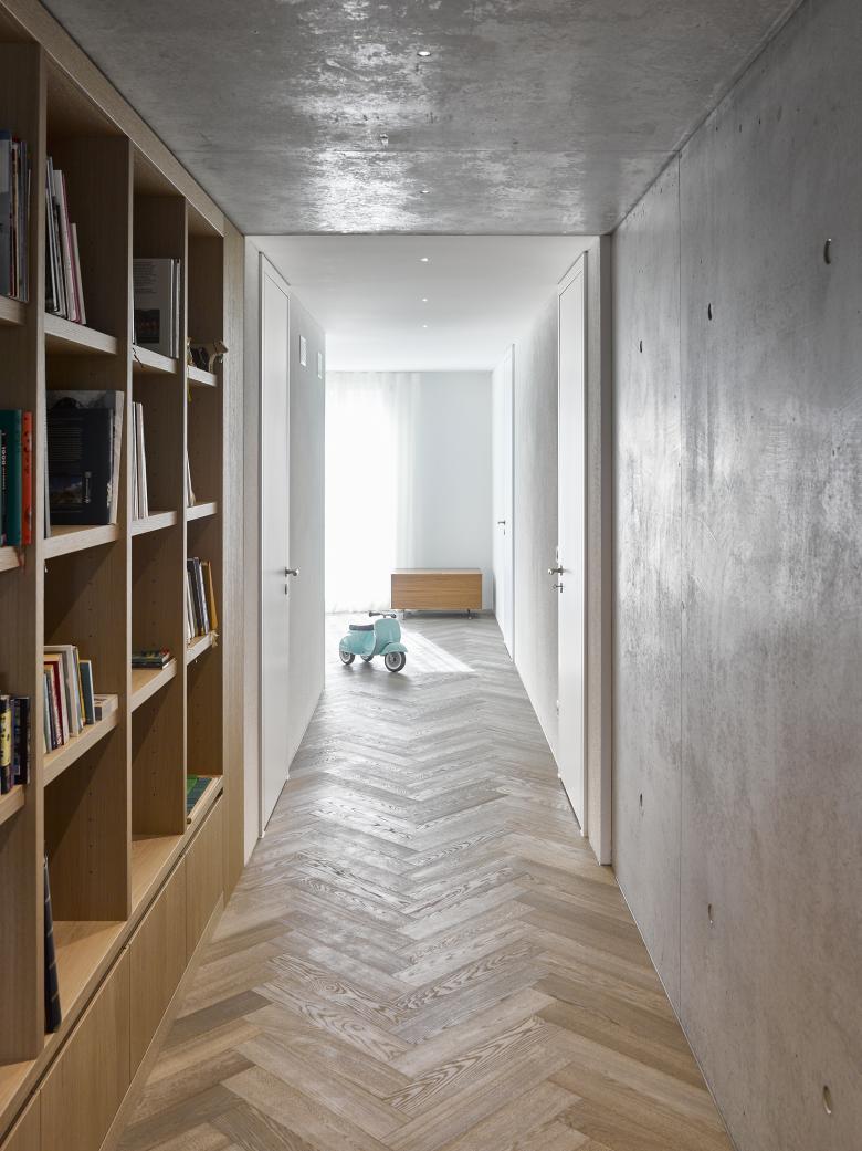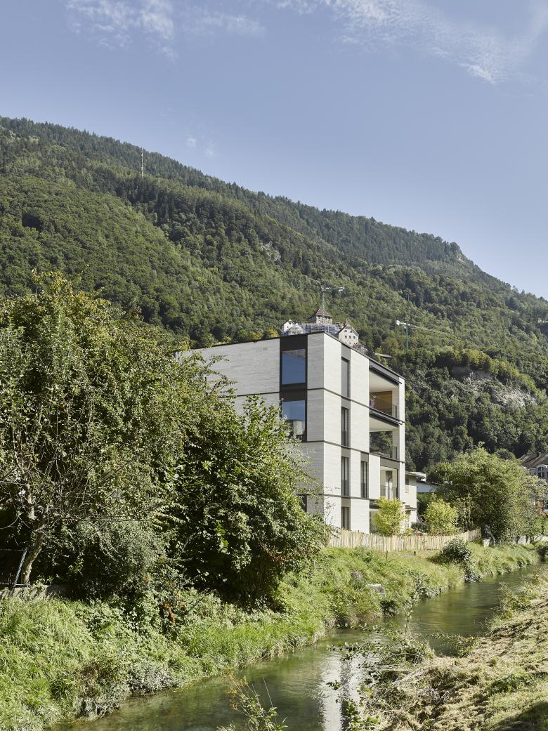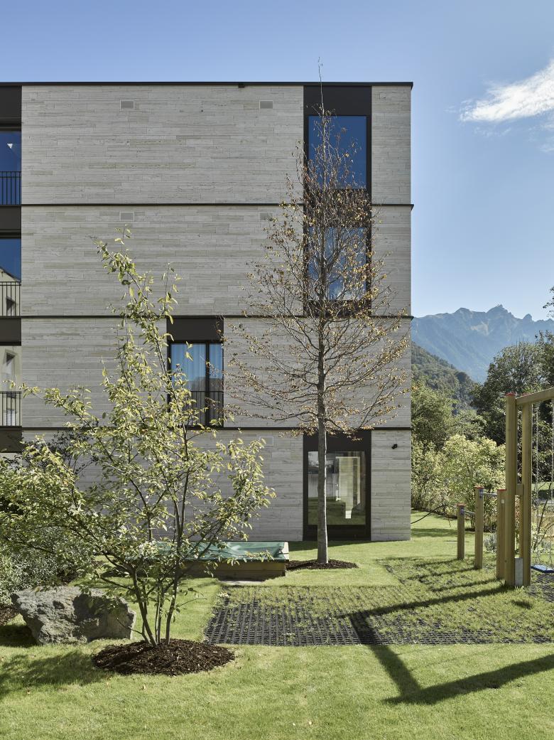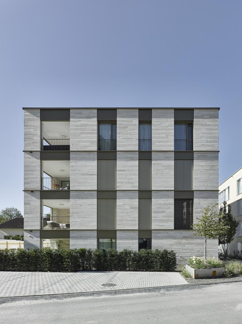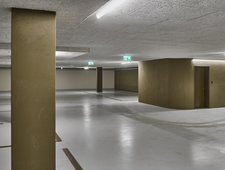 Die Treppenhäuser verbinden die Wohnhäuser mit der gemeinsam erschlossenen Tiefgarage und den darunterliegenden Kellerräumen. Jede Wohnung verfügt über einen privaten Aussenraum welcher als Loggia in das Volumen eingebunden ist. Im Innern der Körper spiegeln sich die unterschiedlichen Bedürfnisse der Eigentümer wieder. Die Wohnräume gliedern sich um die Loggias und erhalten durch diese einen zusätzlichen Wohnraum im Sommer.