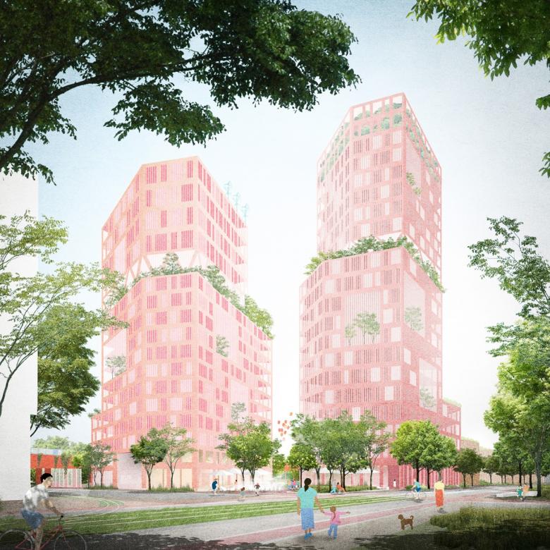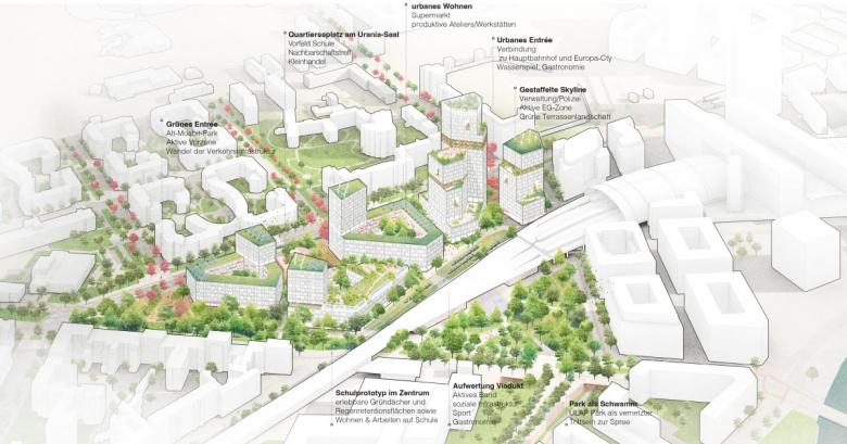 Städtebaulich vermittelt die bauliche Struktur des Quartiers durch seine Baukörpersetzung und vor allem seine Höhenentwicklung zwischen den höchst unterschiedlichen Maßstäben seiner Umgebung. Auf der einen Seite das internationale und touristisch/kommerziell/business-geprägte Bahnhofsquartier mit seinen Hochhäusern sowie und auf der anderen Seite Moabit und die Heinrich Zille Siedlung mit ihren durchgrünten und nachbarschaftlichen Kiezstrukturen. Genau dieser Link gelingt durch eine konsequente Höhenstaffelung mit Ausbildung einer neuen Skyline nach Süden und eine intensive Vernetzung des qQuartiers mit den öffentlichen Räumen der Umgebung.