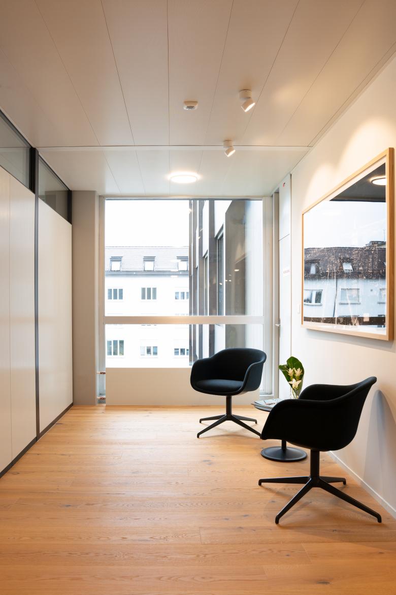 Bei der Neugestaltung dieser Anwaltskanzlei in Bern standen Eleganz und Funktionalität im Mittelpunkt. Eiche wurde für den Boden und die Möblierung eingesetzt und schafft eine wertige, zeitlose Atmosphäre.