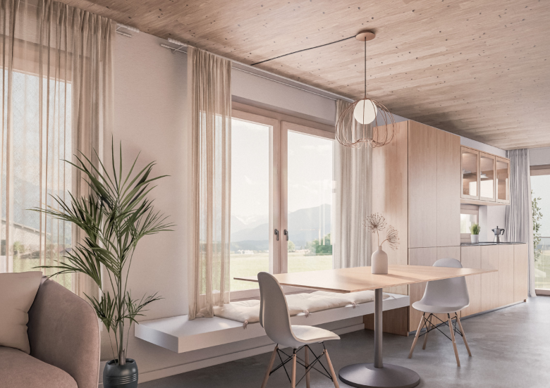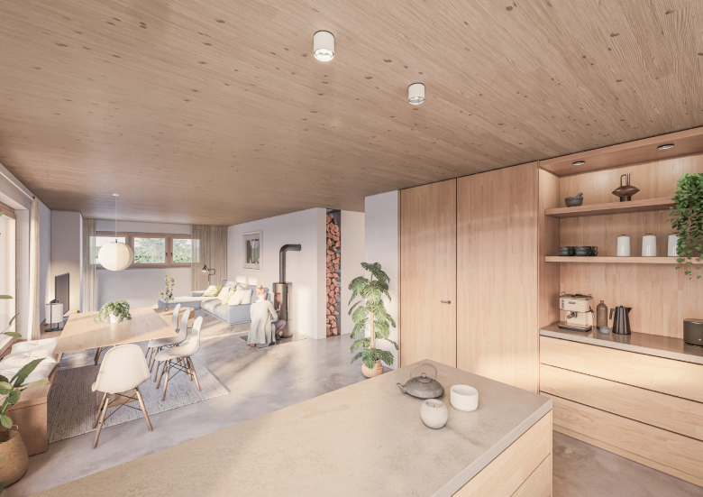Die Bauweise folgt einem nachhaltigen Konzept, das auf moderne Holzleichtbauweise setzt. Die Konstruktion besteht aus Holz, ergänzt durch langlebige Materialien wie Feinsteinzeug und hochwertige Natursteinoberflächen. Holz als zentraler Baustoff reduziert nicht nur das Gebäudegewicht, sondern verbessert auch das Raumklima und minimiert den Energieverbrauch. Durch den Einsatz innovativer Dämmstoffe und dreifach verglaster Fenster entstehen lichtdurchflutete Räume mit angenehmer Atmosphäre, die sich durch hohe Energieeffizienz auszeichnen. Eine Fußbodenheizung mit smarter Steuerung sowie eine nachhaltige Wärmeversorgung gewährleisten niedrige Betriebskosten und eine ressourcenschonende Energienutzung.